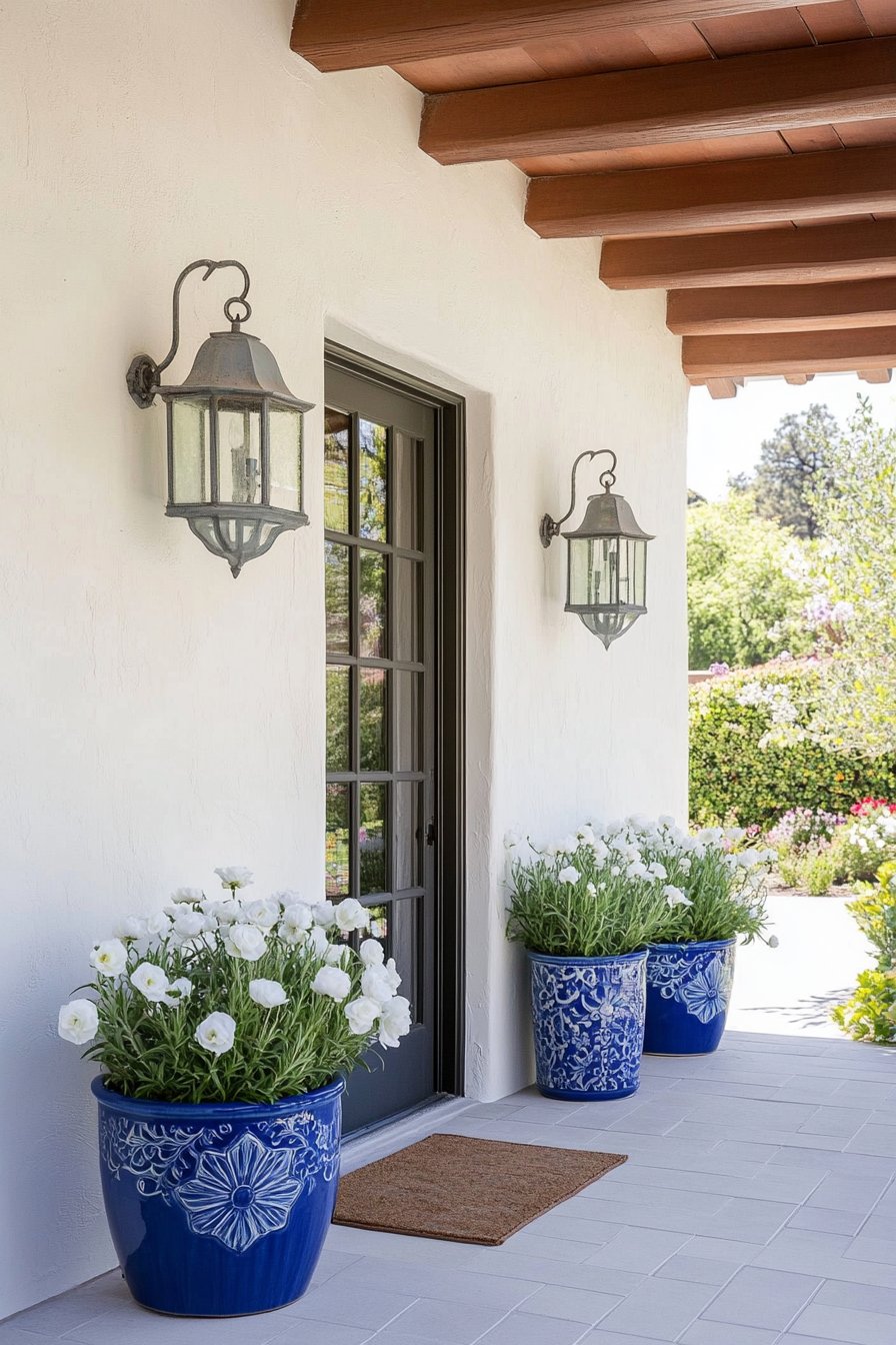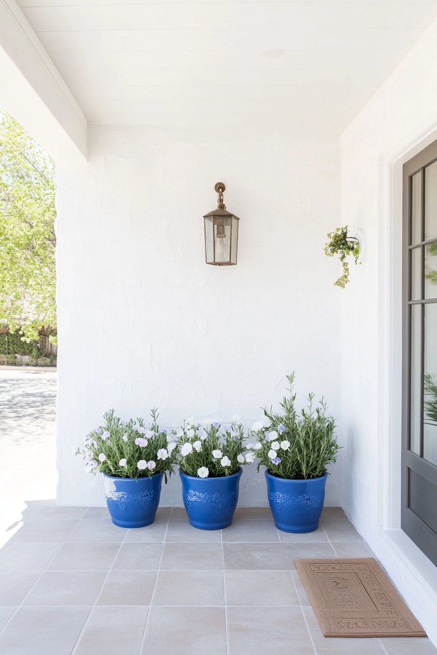 Vibrant blue pottery paired with lush creates a stunning contrast that elevates any entryway’s charm. To replicate this look, choose ranunculus or petunias for easy maintenance and striking blooms.