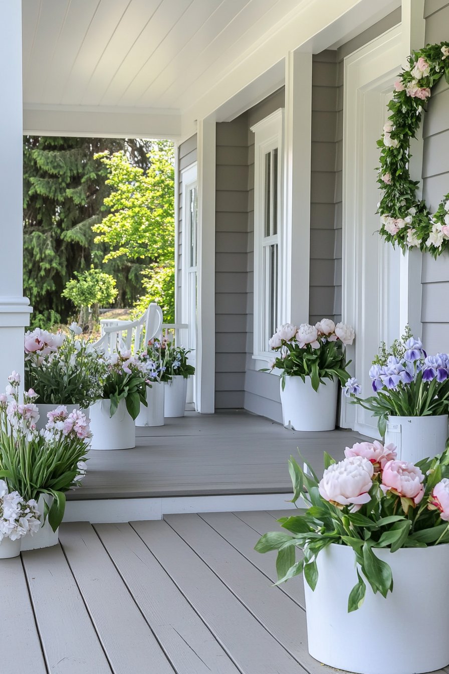 This contemporary porch showcases stunning and irises in sleek white planters, creating a harmonious blend of color and elegance. To achieve a similar look, choose a mix of perennials and place them in coordinated pots for a fresh, inviting atmosphere.