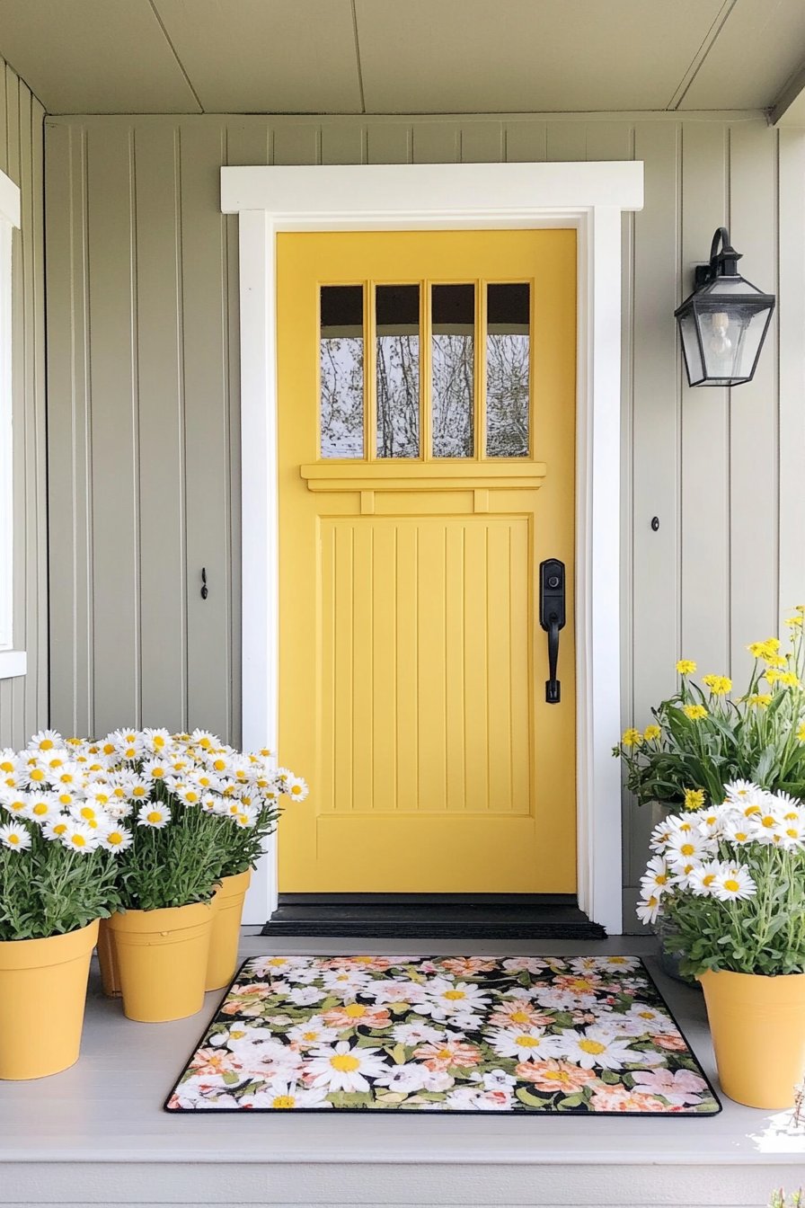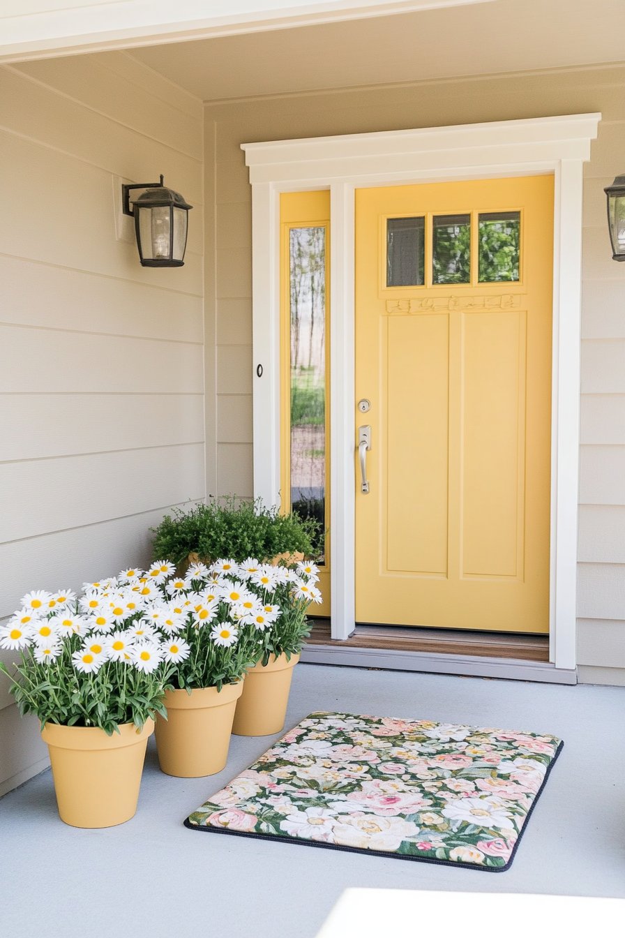 Bright yellow daisies in cheerful planters create a welcoming entrance, complemented by a vibrant floral mat that adds warmth. To achieve this look, mix perennial flowers with colorful pots and coordinate with a decorative doormat.
