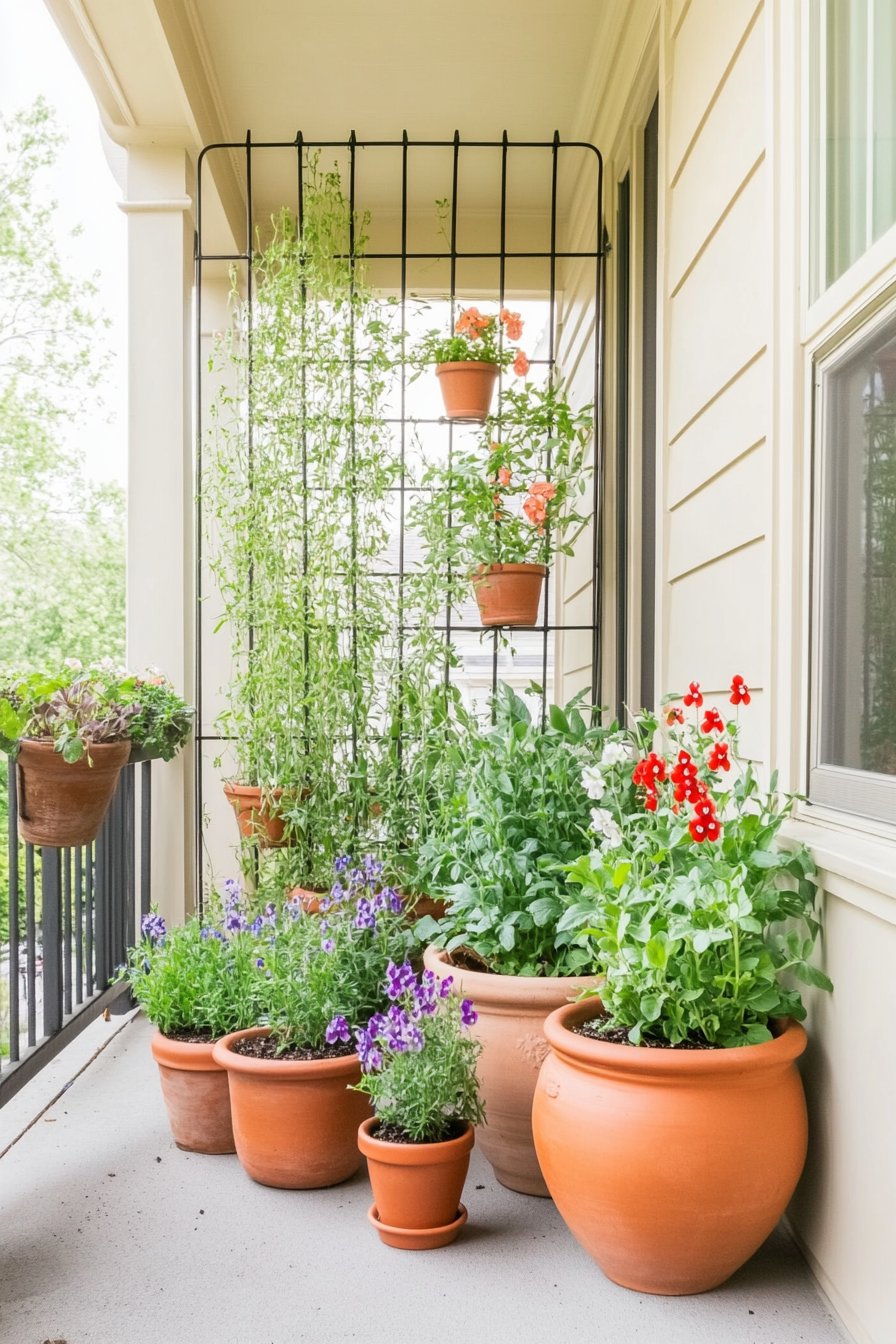 This vibrant vertical container garden showcases cascading greenery intertwined with colorful blooms like red and purple flowers, creating a lively atmosphere. To replicate this look at home, use terracotta pots of varying sizes and choose a mix of trailing and upright plants for dynamic visual interest.
