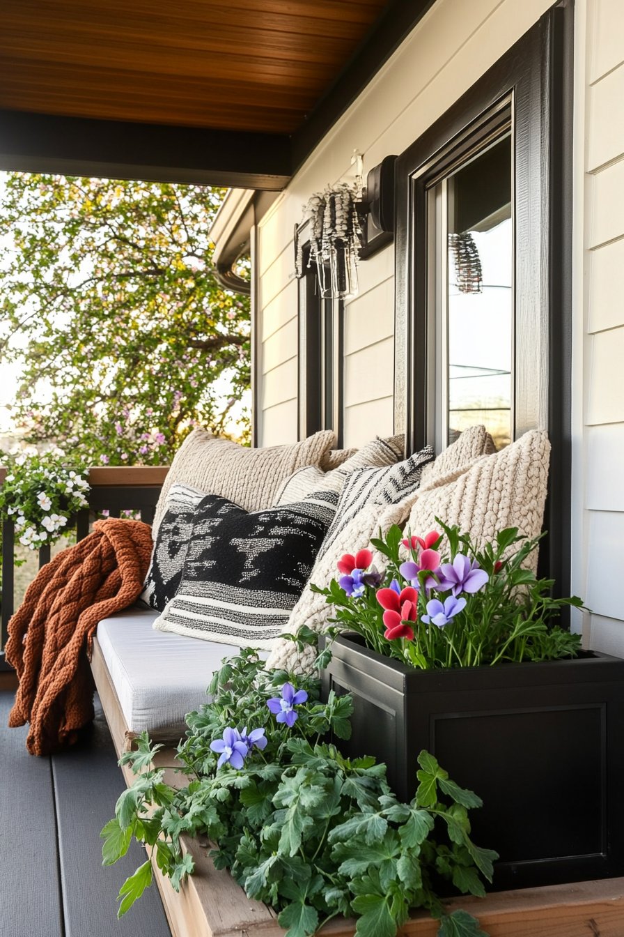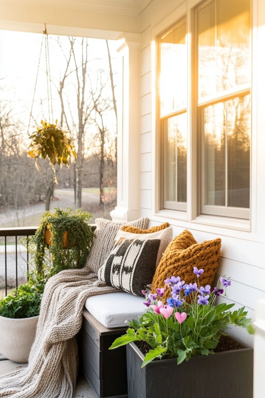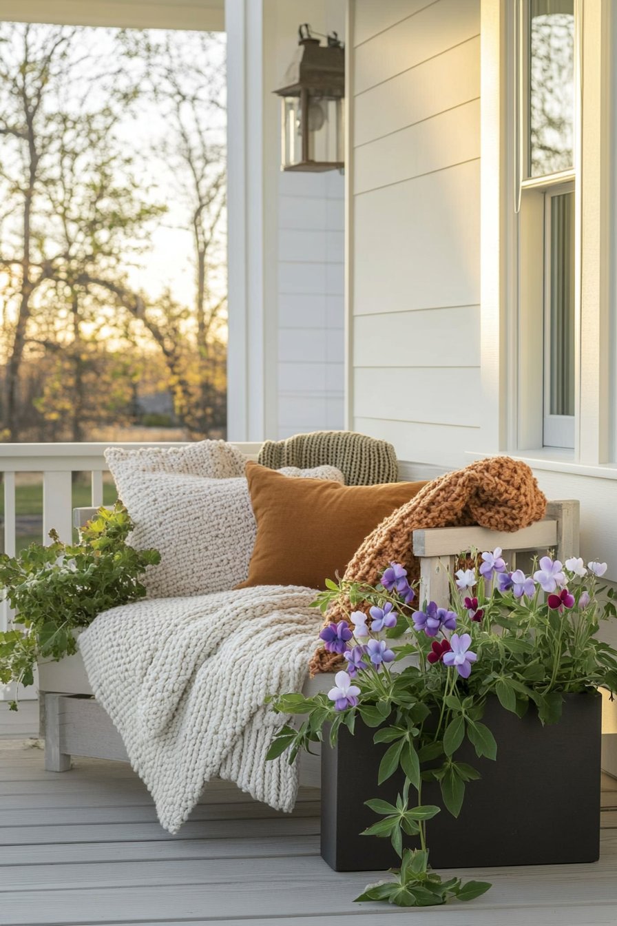 A cozy porch adorned with vibrant violas creates a welcoming atmosphere, perfectly complemented by soft textures like chunky knit blankets and plush pillows. To replicate this inviting look, use colorful planters and layer comfortable seating with seasonal throw blankets for added warmth and charm.