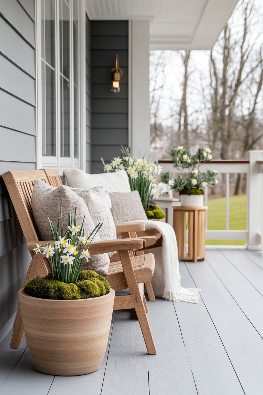 The modern porch design features cheerful daffodils in natural wood planters, offering a fresh pop of yellow against neutral tones. To recreate this look, incorporate soft seating with textured cushions and select vibrant seasonal flowers for an inviting atmosphere.