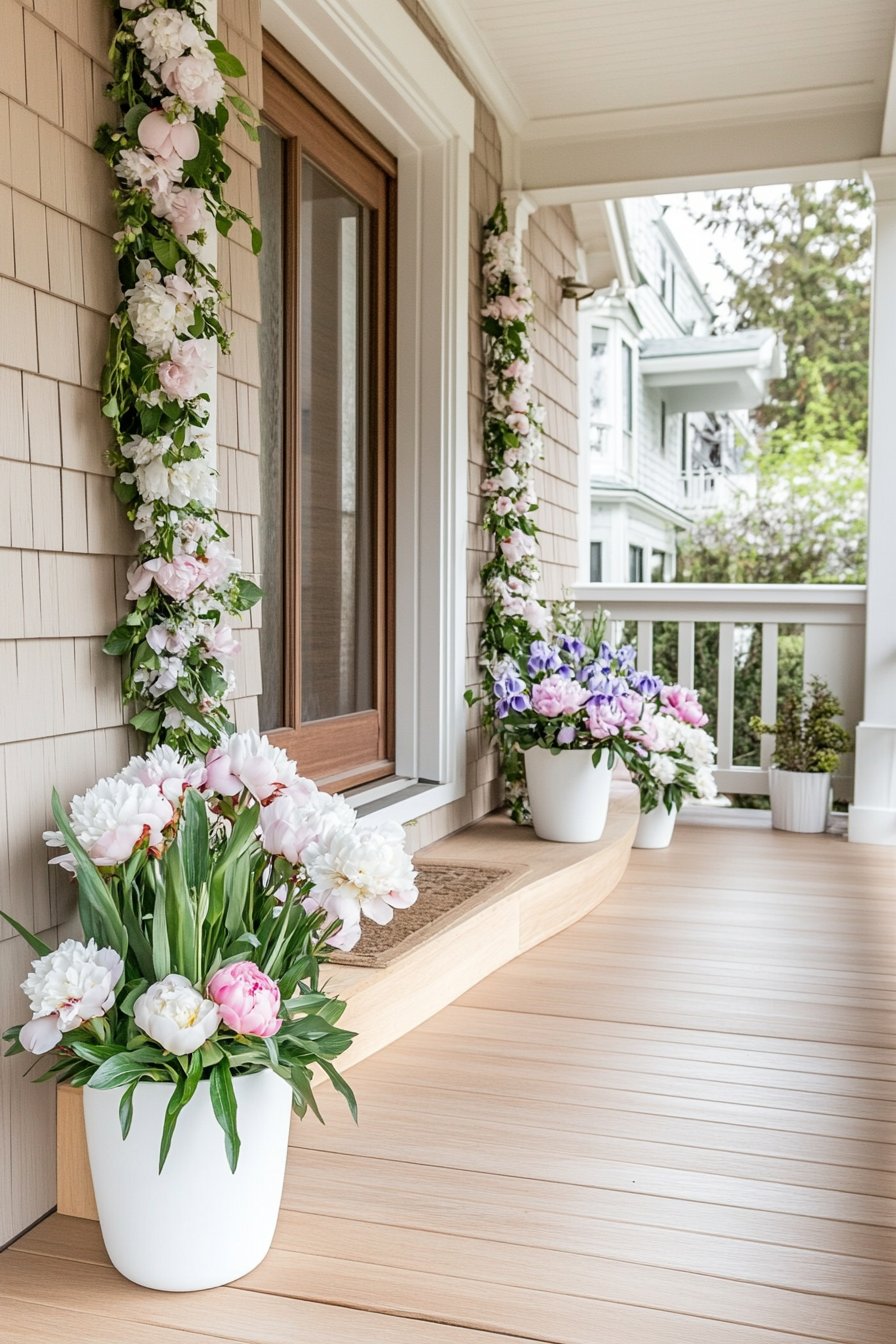 This design beautifully showcases lush peonies in soft pink and white tones, creating a romantic and inviting atmosphere. To replicate this look, use elegant pots and incorporate trailing greenery for added depth and texture.