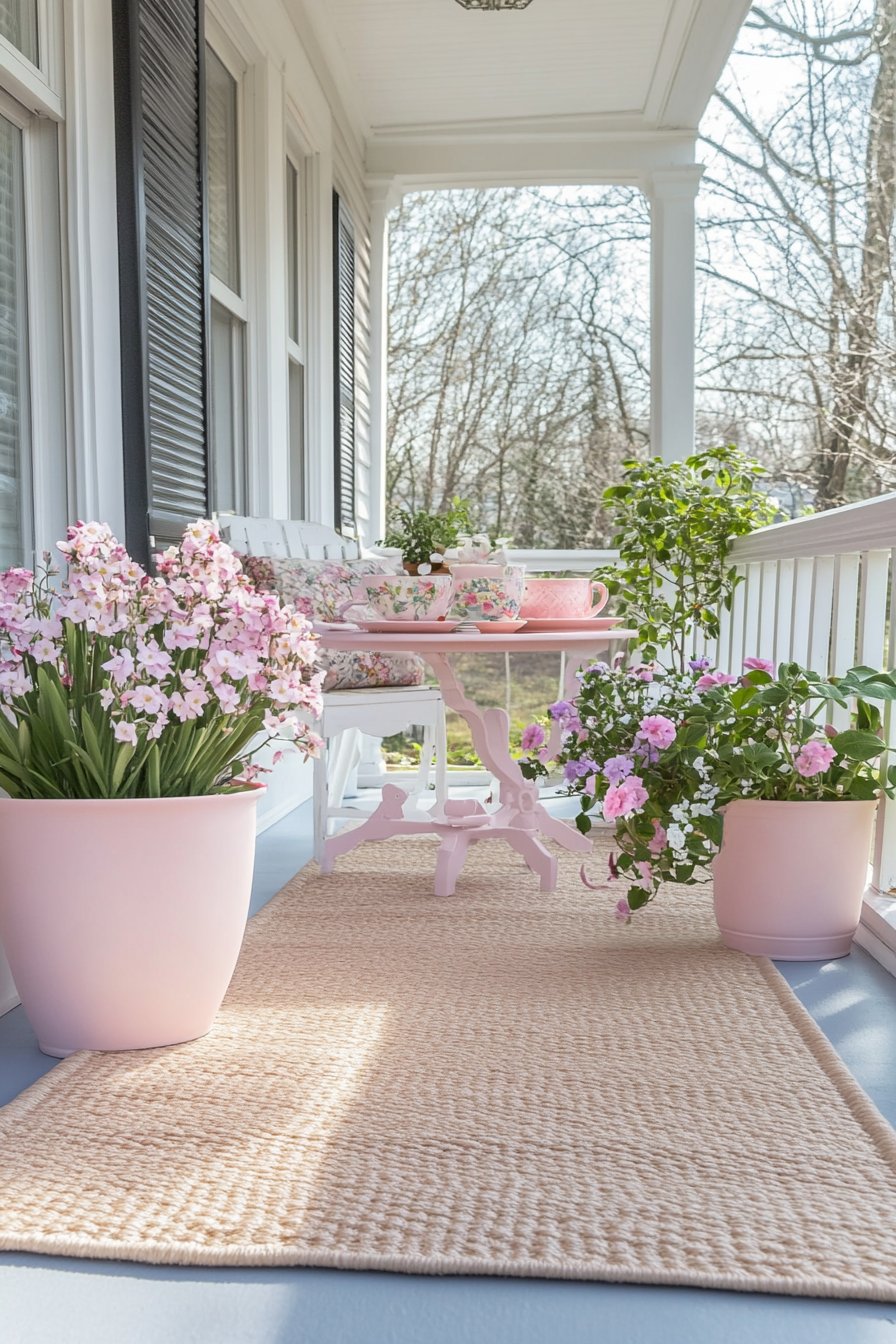 Soft pinks of impatiens and delicate blossoms create a charming, inviting atmosphere on the porch, complemented by pastel pots and a cozy seating area. To replicate this look, choose vibrant flowers that thrive in your climate and incorporate light, airy accessories for a fresh, welcoming vibe.