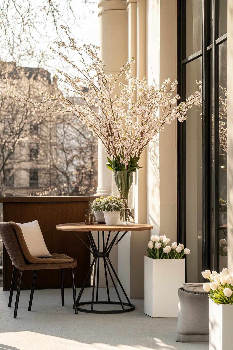 This design beautifully integrates soft white tulips and delicate cherry blossoms, creating a fresh and inviting atmosphere perfect for spring. Enhance your own space with minimalistic planters and a cozy seating arrangement to enjoy the season’s beauty.