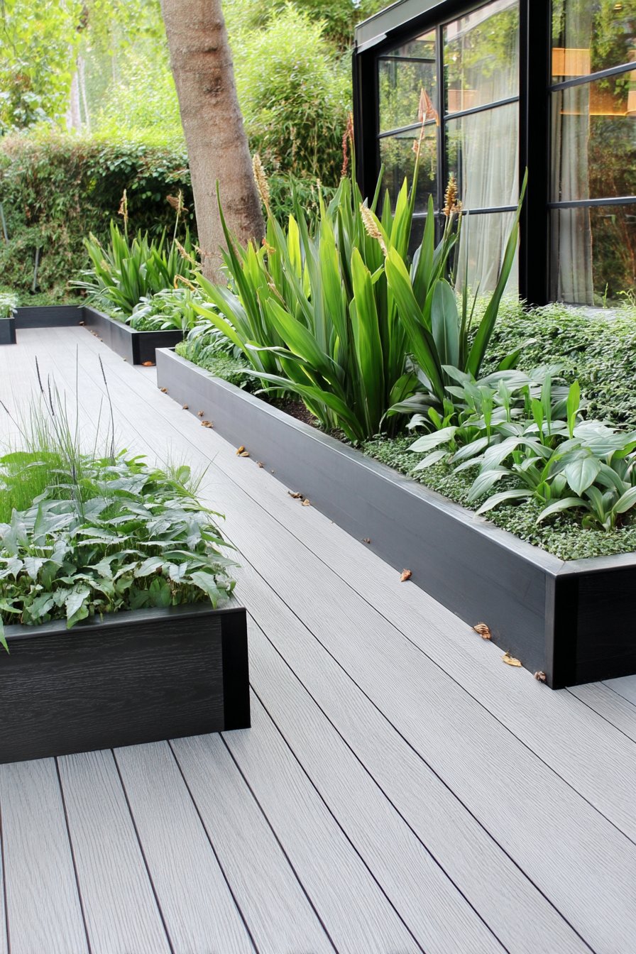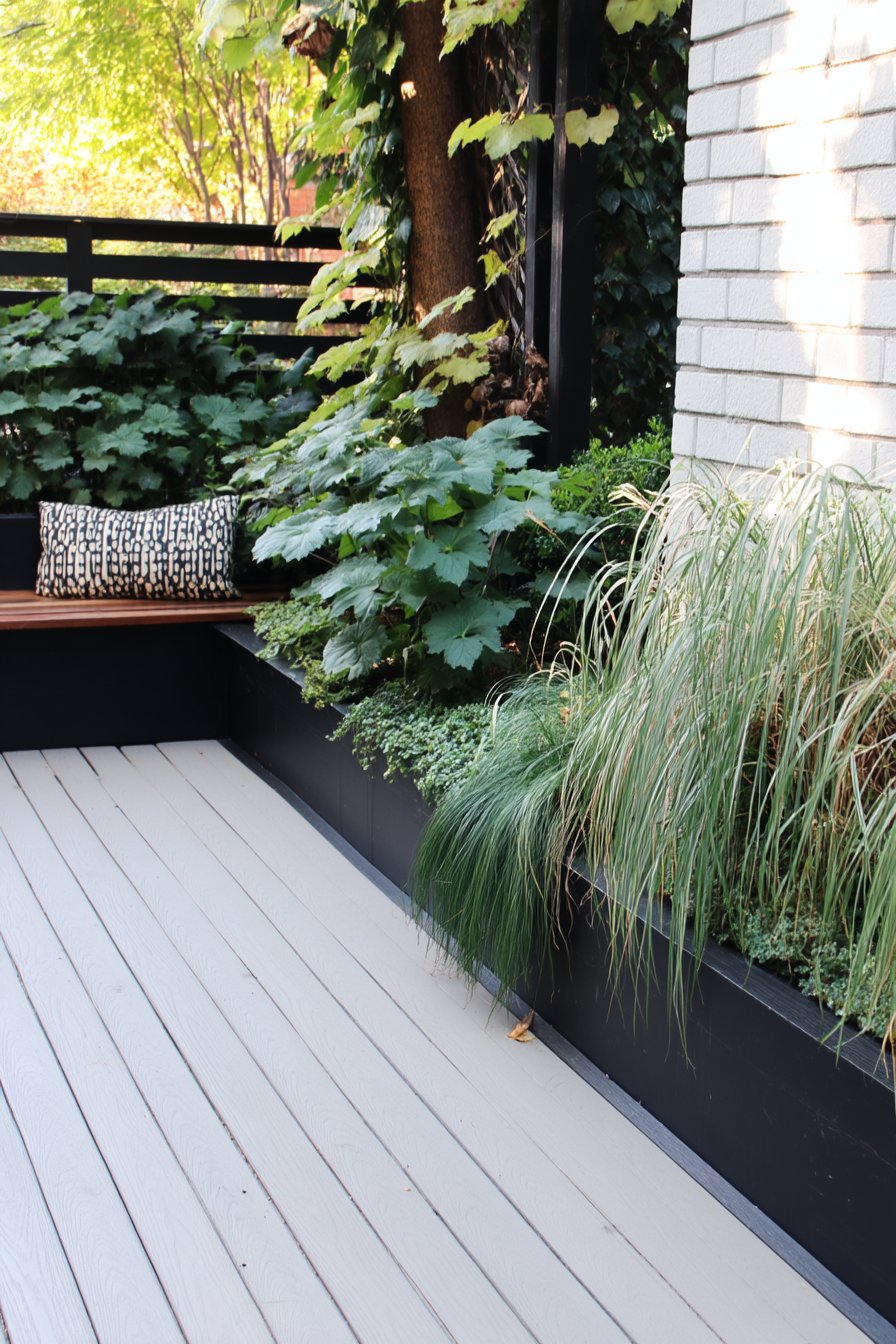 The sleek black planters filled with lush greenery create a striking contrast against the light decking, evoking a modern yet inviting atmosphere. Incorporate low-maintenance plants like hostas and ferns for a similar effect, ensuring to mix heights for visual interest.