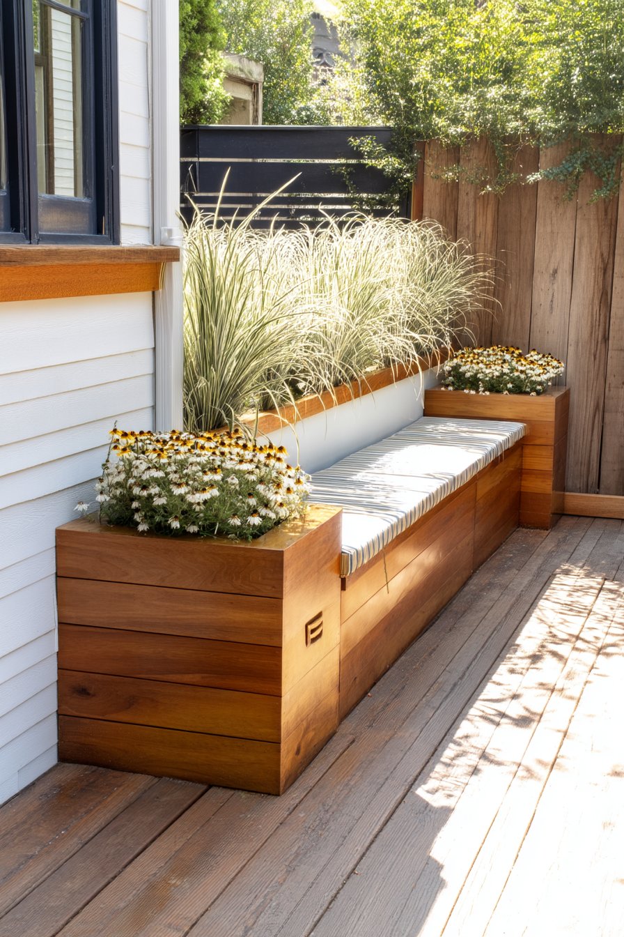 This design beautifully combines sleek wooden planters with cheerful daisies and soft ornamental grasses, creating a vibrant yet serene atmosphere. To replicate this look, choose low-maintenance flowering plants and incorporate comfortable seating to enhance outdoor enjoyment.