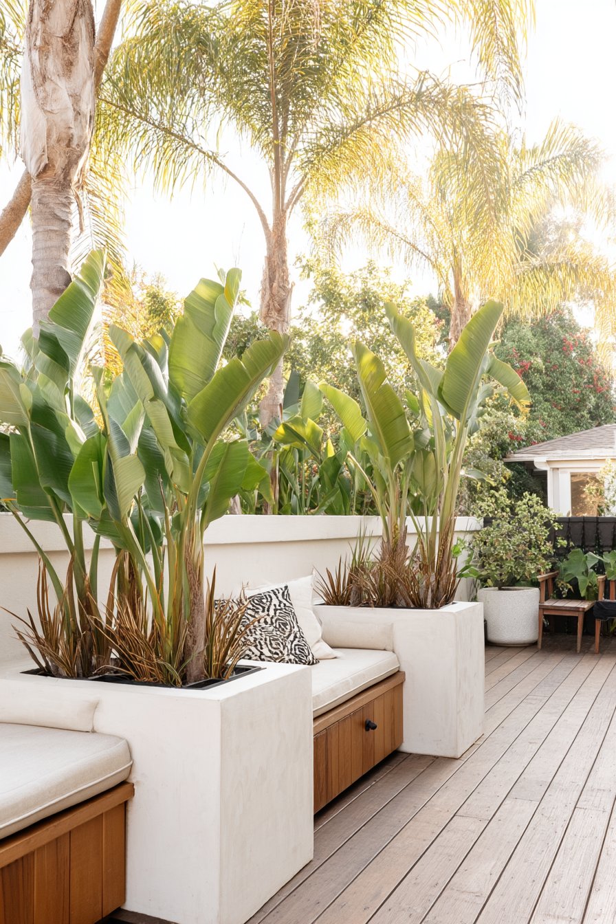 The lush banana plants and elegant grasses create a vibrant tropical feel, perfectly complemented by the sleek, modern seating and natural wood accents. To achieve this look, consider incorporating large-leafed plants and comfortable outdoor furniture with clean lines for a seamless blend of nature and style.