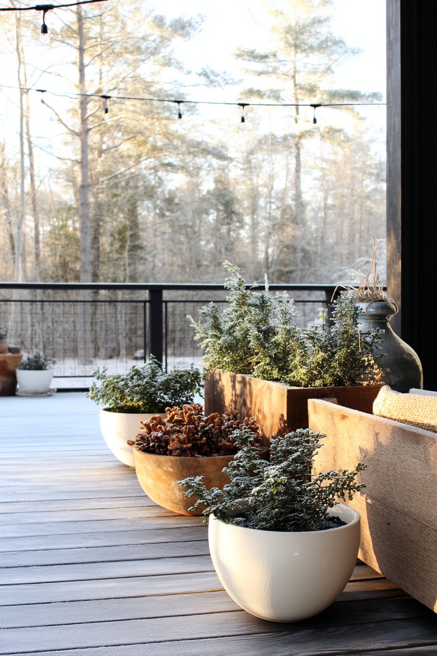 The blend of textured planters with lush greens creates a serene and inviting atmosphere, perfect for relaxation. To achieve this look, use a mix of evergreen plants and varied pot materials for visual interest.