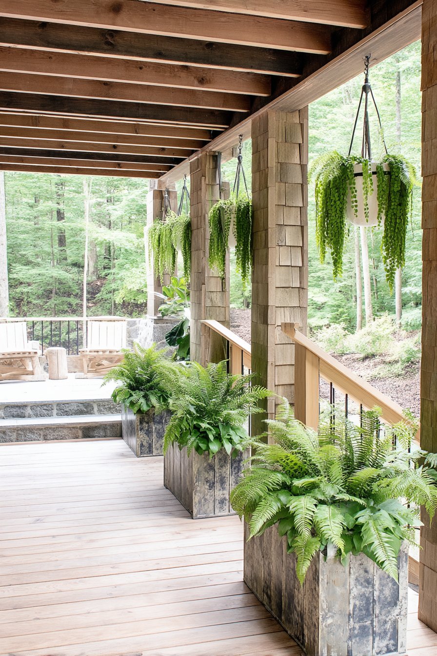 Lush ferns in rustic planters create a serene atmosphere, harmonizing beautifully with natural wood tones and greenery. To replicate this look, choose hardy ferns and consider using weathered containers for added texture.