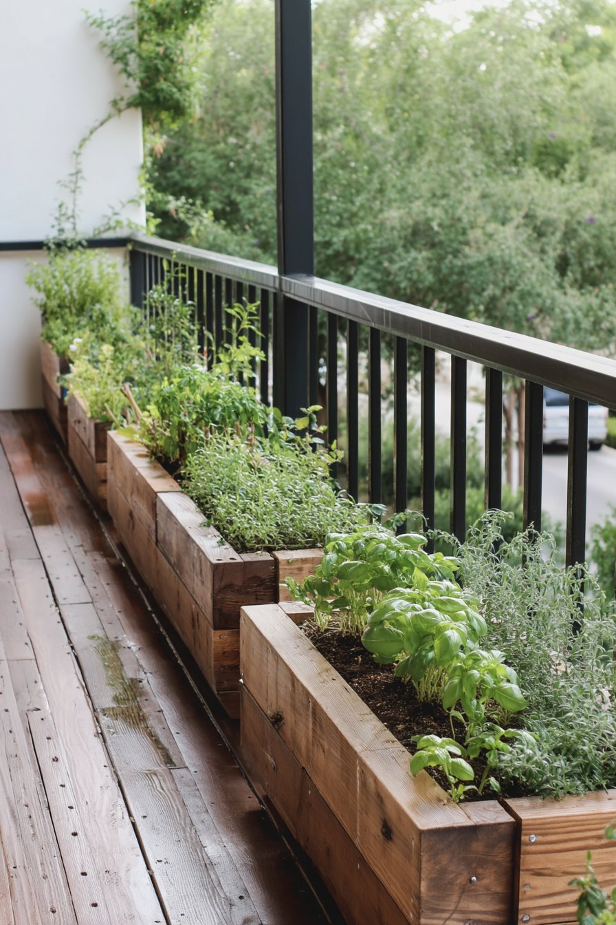 The rustic wooden planters create a warm, inviting space, perfect for growing vibrant herbs like basil, thyme, and rosemary. For a similar look, utilize reclaimed wood for planters and ensure adequate sunlight for your herbs.
