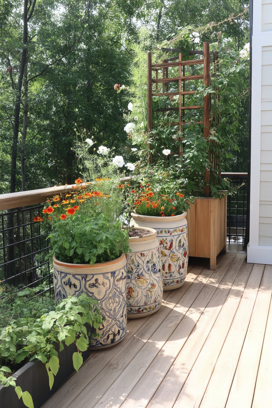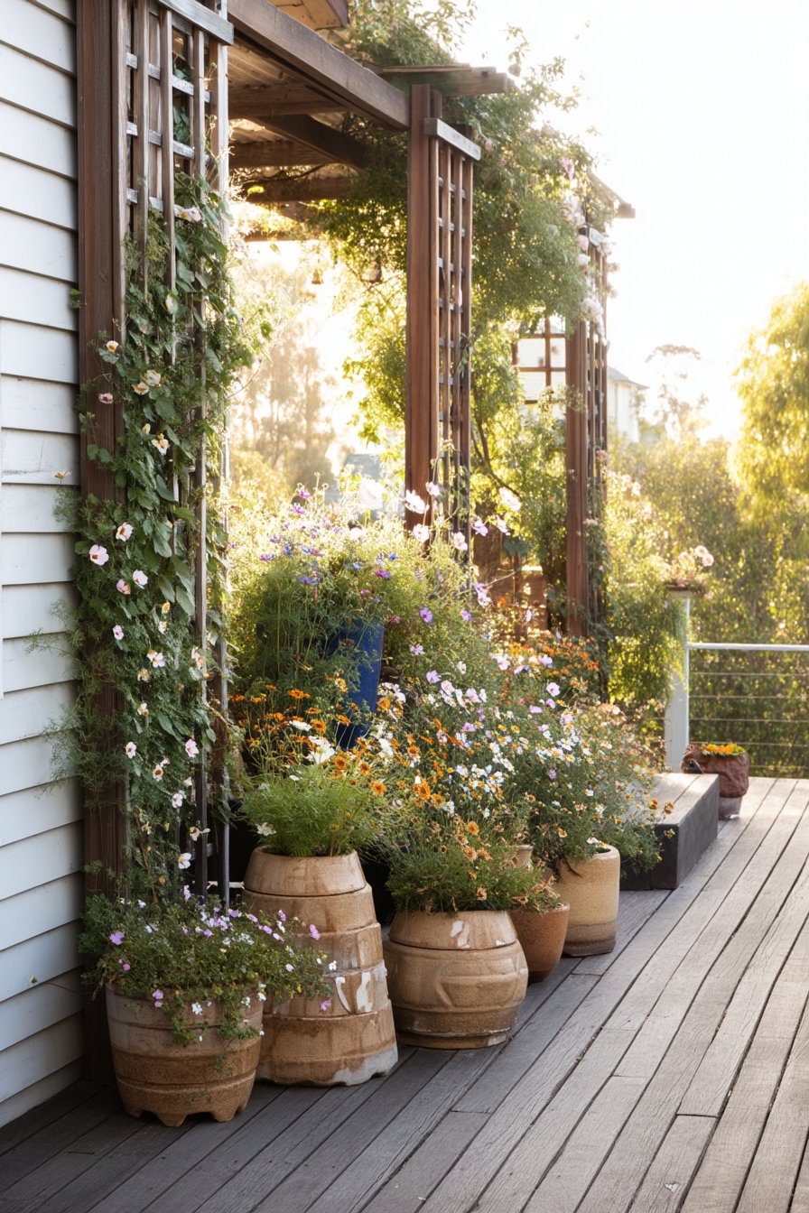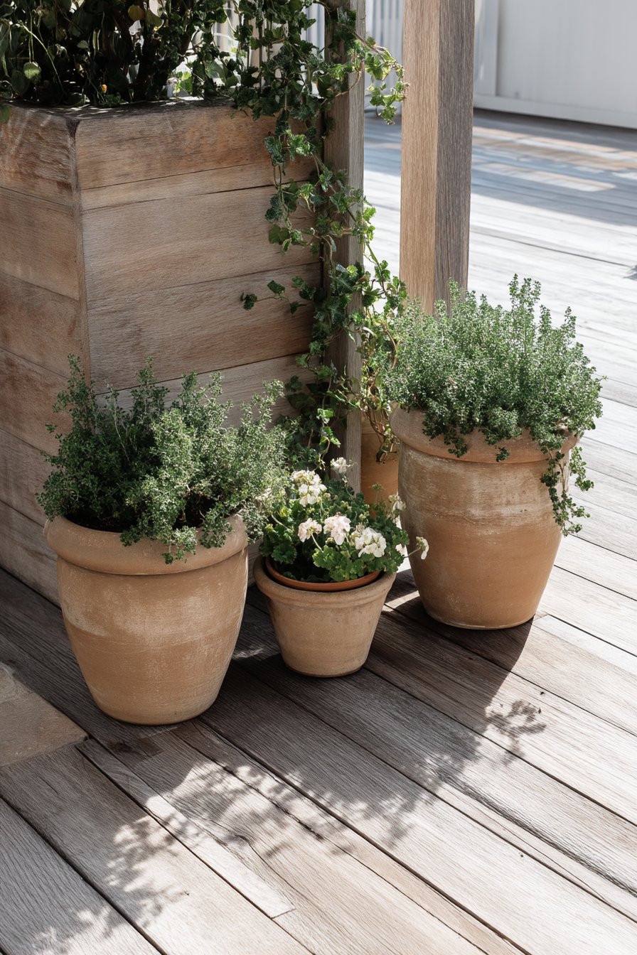 Vibrant terracotta planters filled with marigolds, white , and fragrant herbs create a lively atmosphere on the wooden deck. To replicate this look, mix colorful annuals with perennials for a dynamic display and choose decorative pots to enhance your garden’s charm.