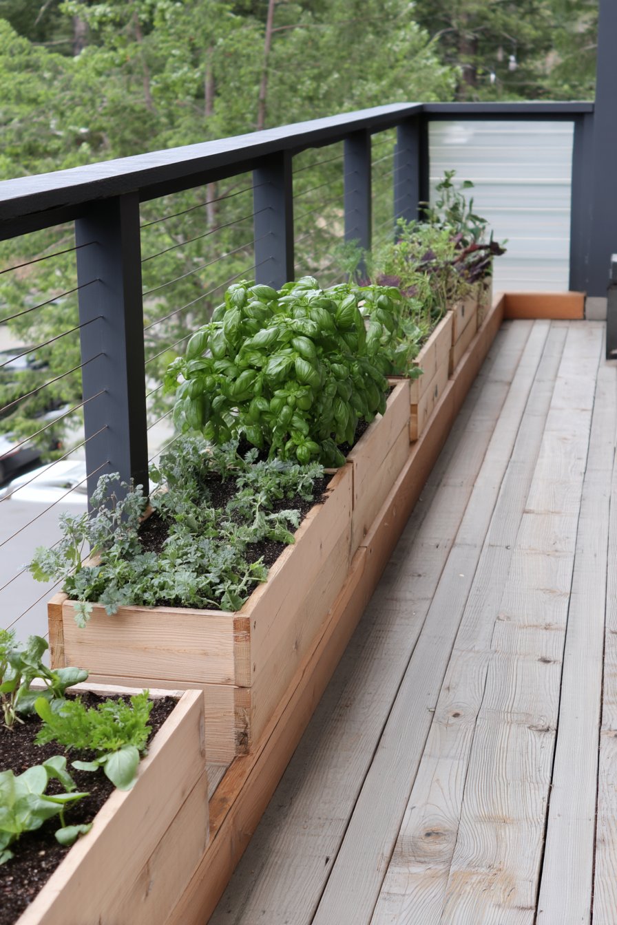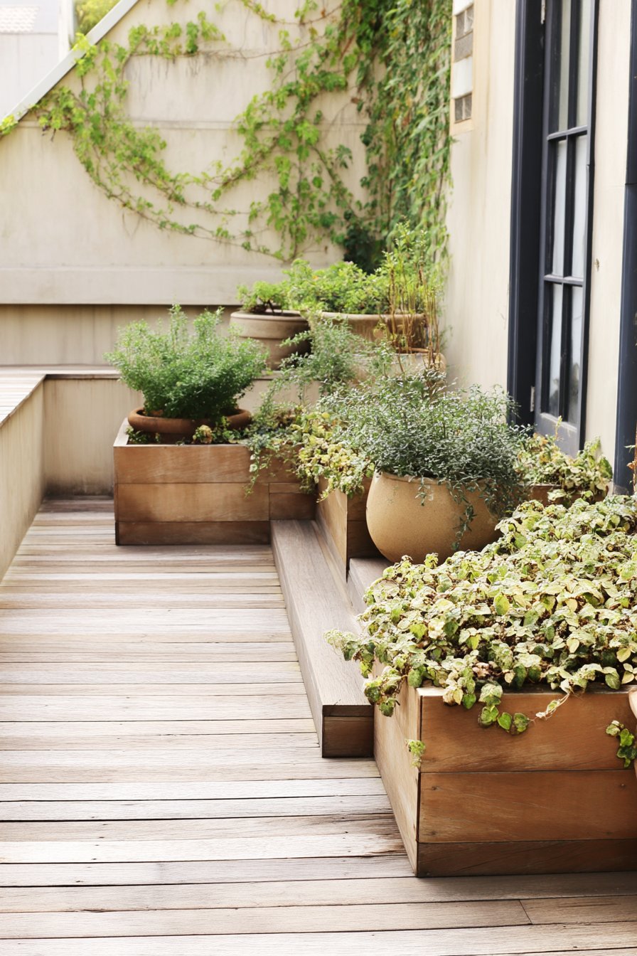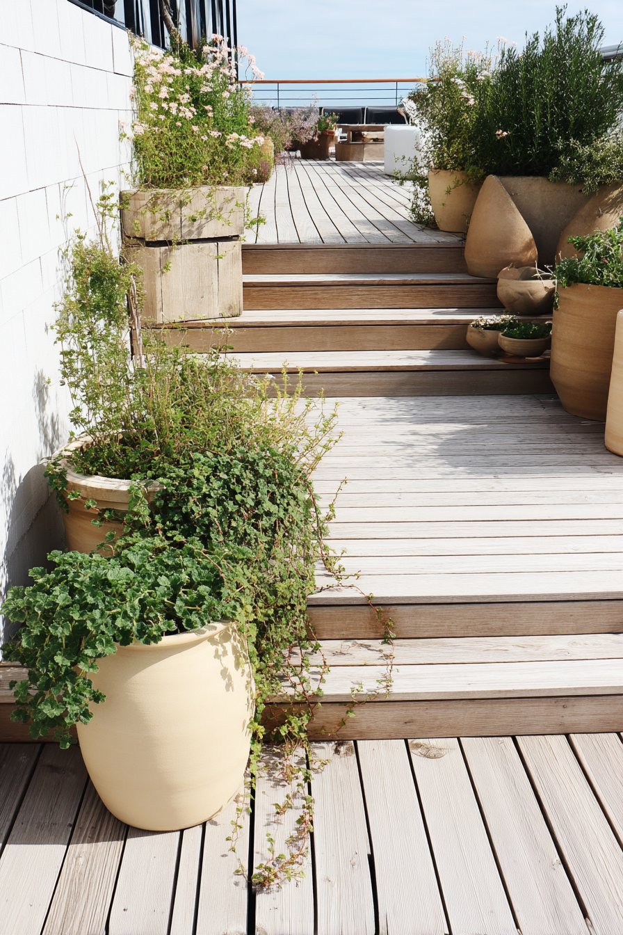 The warm wooden planters filled with fragrant herbs like thyme and mint create a cozy and inviting atmosphere, perfect for any outdoor space. To replicate this look, choose a variety of herbs and arrange them in rustic containers that complement your deck or patio.