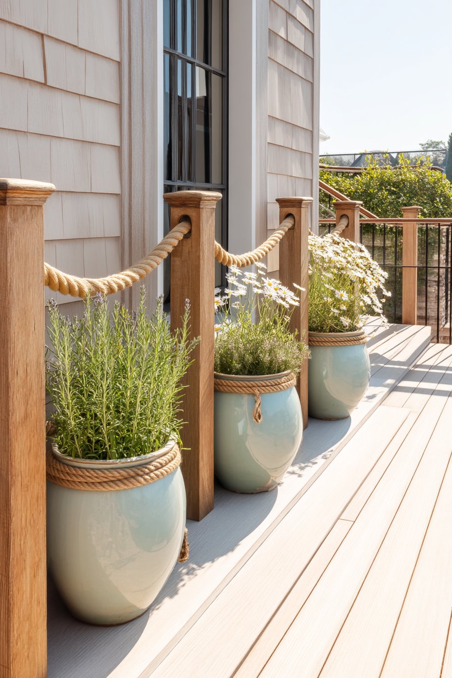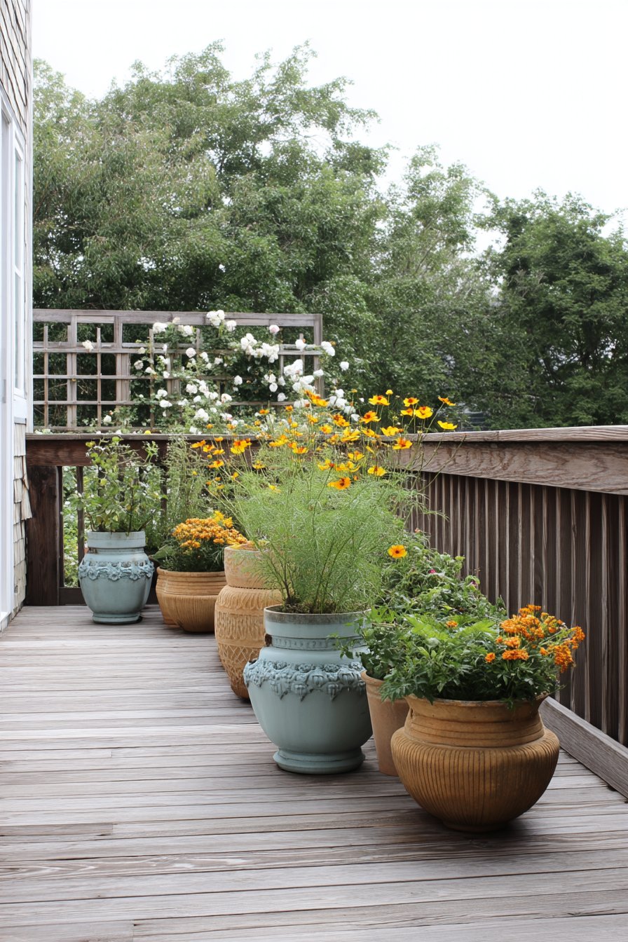 - Utilize Color: Brightly colored planters can add a pop of color against the natural wood or composite decking. Coordinate colors with your home’s exterior for a unified appearance.