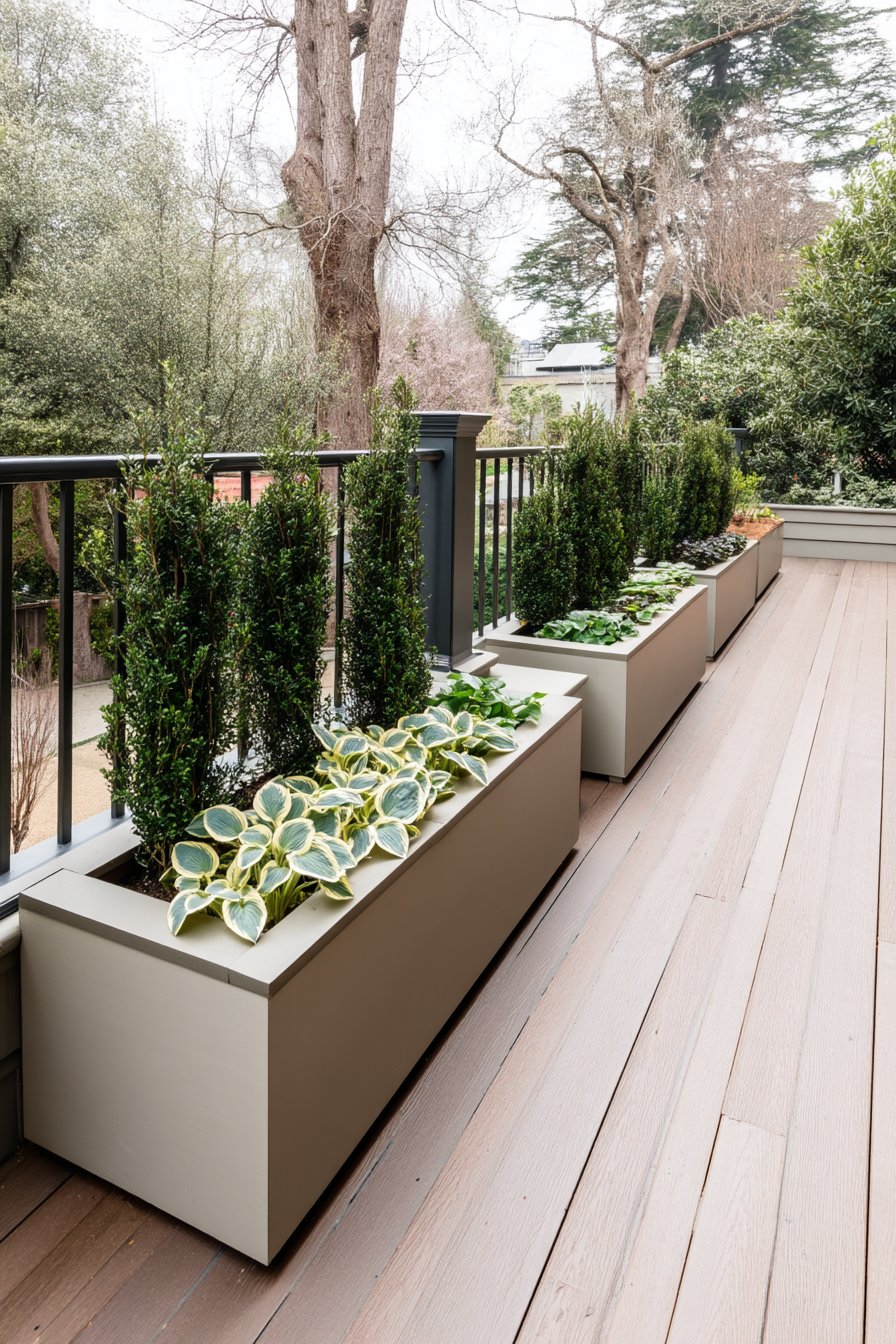 The sleek, modern planters filled with lush boxwood and vibrant hostas create a striking contrast against the warm wooden decking, enhancing any outdoor space. For a similar look, choose minimalist containers and pair evergreen plants with colorful foliage to maintain visual interest year-round.
