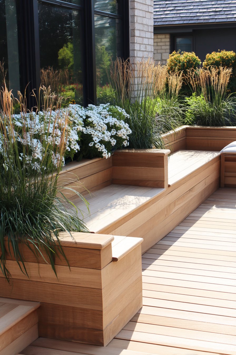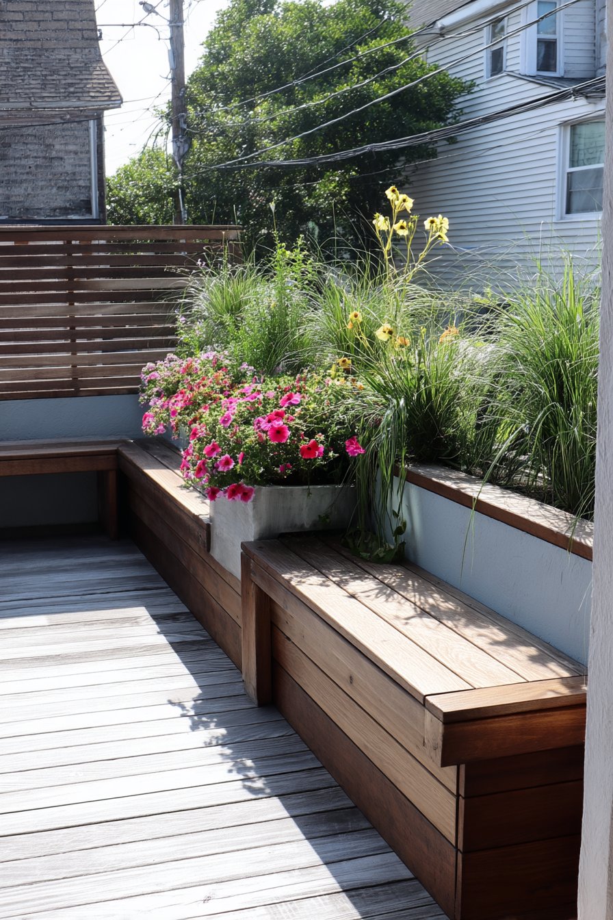 Vibrant petunias and graceful grasses create a stunning contrast against sleek wooden benches, bringing life and warmth to the space. To replicate this look, choose colorful annuals for seasonal pops and consider built-in planters for a modern touch.
