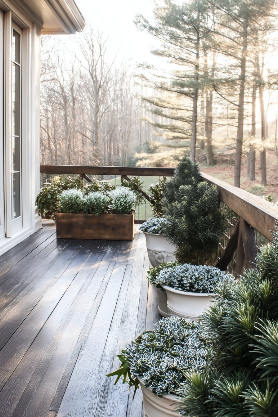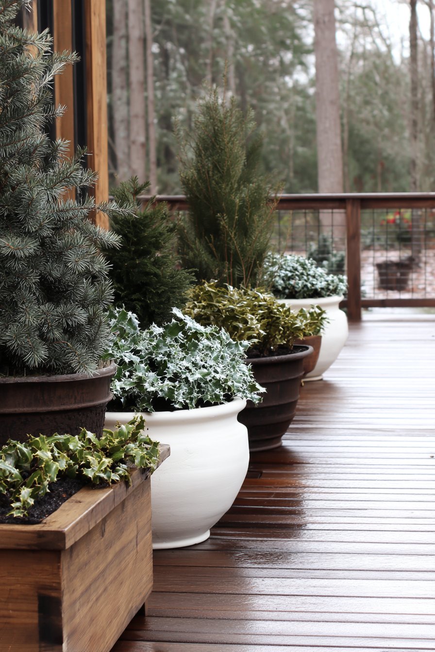 This contemporary deck beautifully showcases evergreen planters filled with lush greenery, including striking holly and vibrant groundcovers that provide year-round interest. For a similar look, choose a mix of evergreen plants in varied textures and use stylish, contrasting pots to enhance your outdoor space.