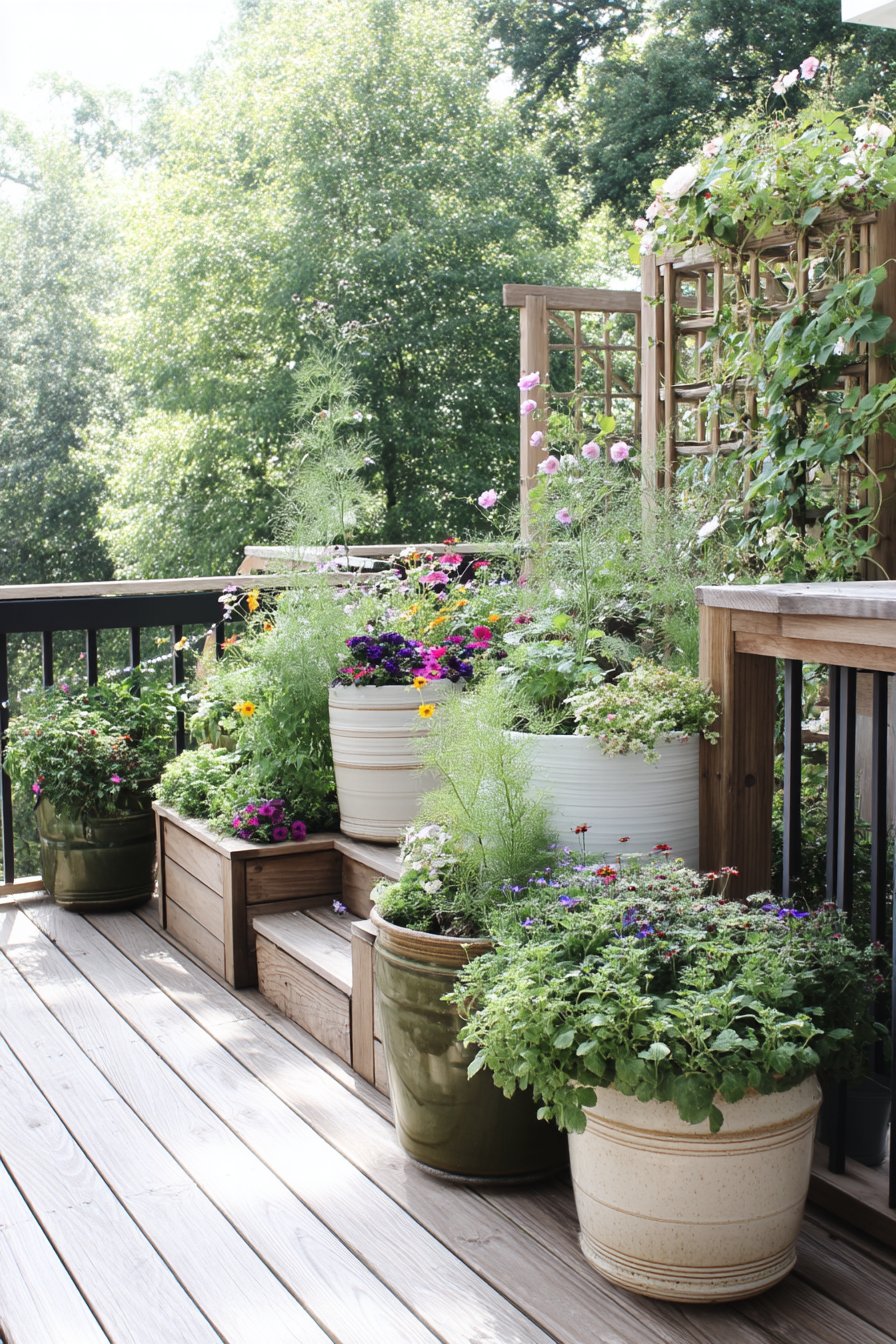 Vibrant containers filled with petunias, geraniums, and daisies create a lively atmosphere, enhancing the deck’s charm with rich colors and varied textures. To replicate this look, choose a mix of annuals and perennials for continuous blooms, and consider varying pot sizes for visual interest.