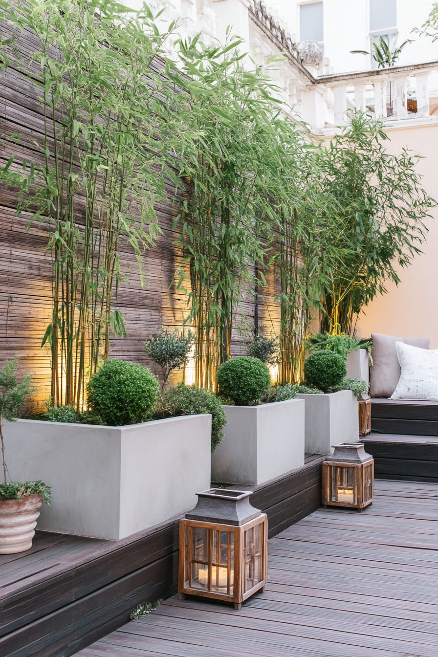 The sleek bamboo planters paired with lush greenery create a serene, modern oasis, enhanced by the warm glow of lanterns. Incorporate low-maintenance plants like boxwoods and bamboo for a stylish, tranquil outdoor space.