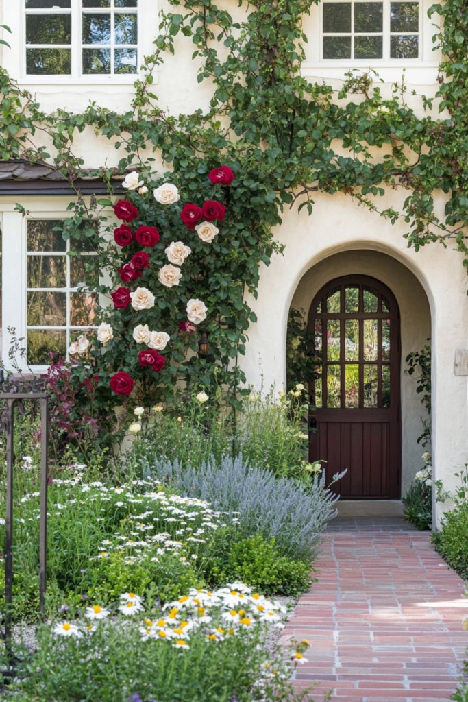 Crimson and cream roses climb an ivy-covered facade in this vintage garden. An arched gate leads to a brick pathway bordered by sage, thyme, and daisies, creating a fragrant, peaceful entrance to the charming countryside home.