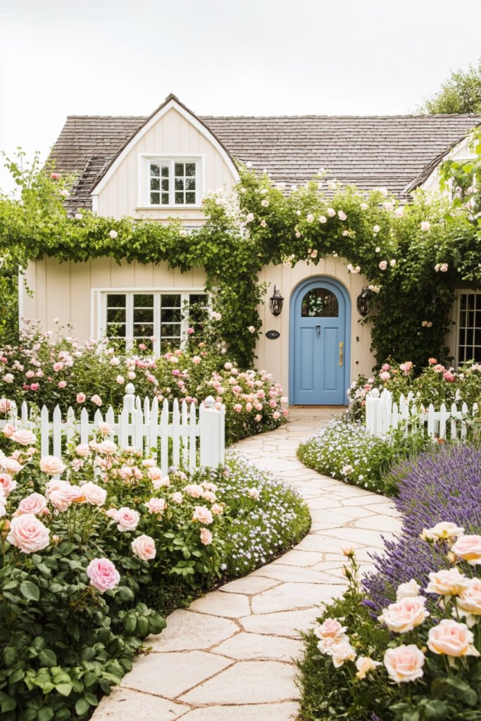 Pastel pink and cream roses climb alongside a winding stone pathway leading to a blue front door. A low white picket fence encloses beds of lavender and daisies, while ivy gracefully climbs the cottage walls, enhancing its cozy, timeless appeal.