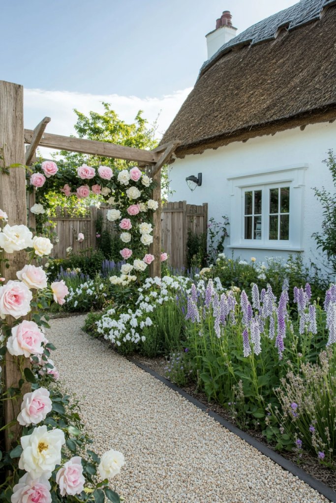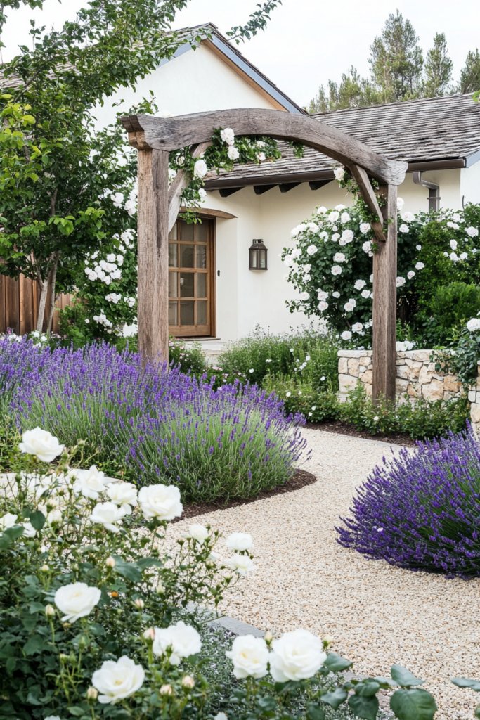 Soft purple lavender, white roses, and climbing jasmine fill this rustic cottage garden. A wooden arch frames the gravel path leading to the front door, while a low stone wall encloses the lush greenery for a cozy, welcoming feel.