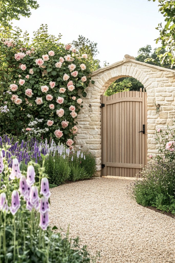Pastel roses climb the stone walls of this romantic garden. An arched wooden gate opens to a gravel pathway bordered by foxgloves, lavender, and hydrangeas, leading the way to a picturesque countryside retreat.