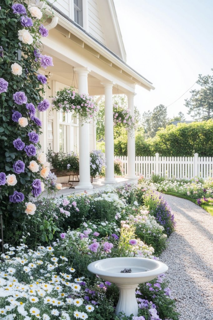 Pastel roses and purple clematis climb the porch columns of this sunlit garden. A gravel pathway winds through borders of daisies and hydrangeas, while a white picket fence surrounds a birdbath centerpiece, offering a tranquil, vintage-inspired setting.