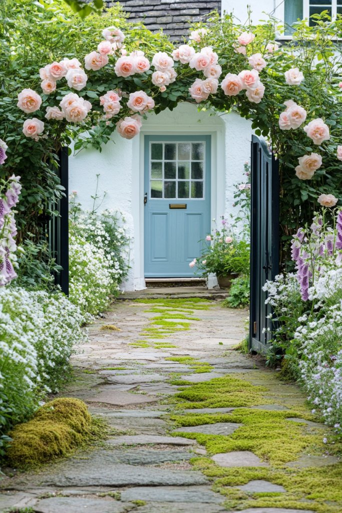 Pale pink roses arch over an entrance gate in this serene garden. A moss-lined stone path winds toward a blue front door, surrounded by foxgloves and creeping thyme blooming in full, creating a peaceful hideaway.