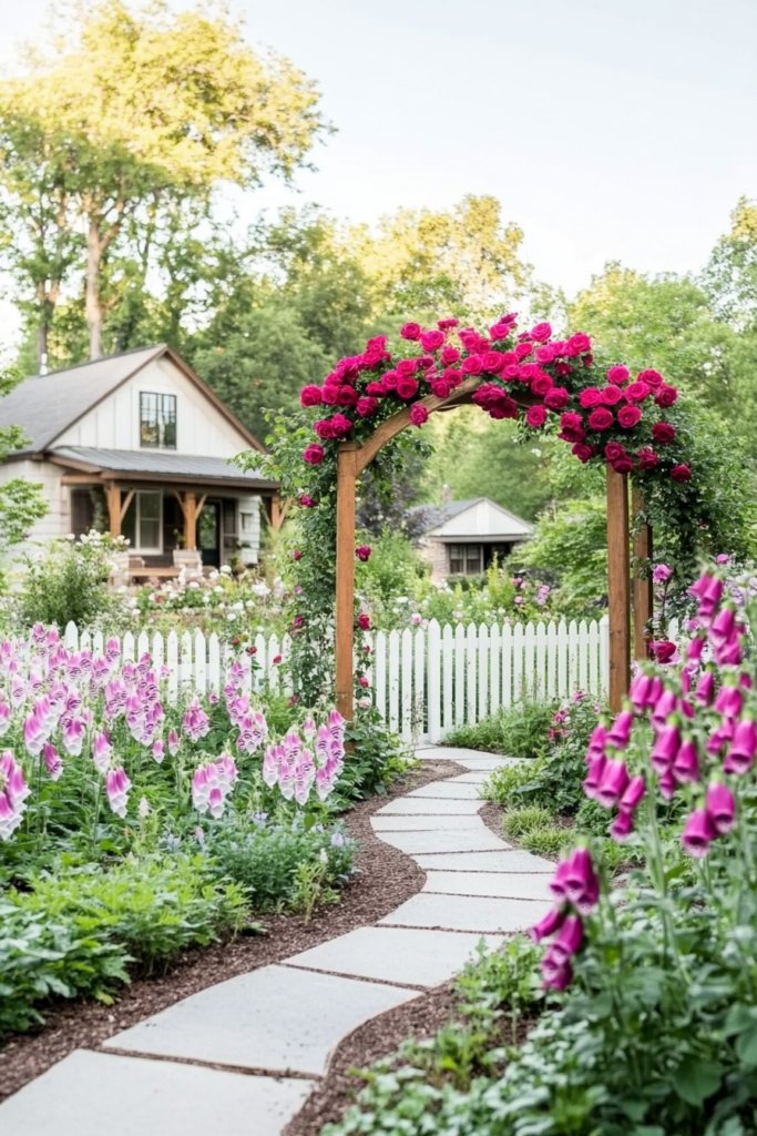 Magenta roses cascade over a wooden archway, framing a winding stone pathway lined with foxgloves. A low picket fence encloses this whimsical space, while a quaint cottage serves as the perfect backdrop for this enchanting scene.