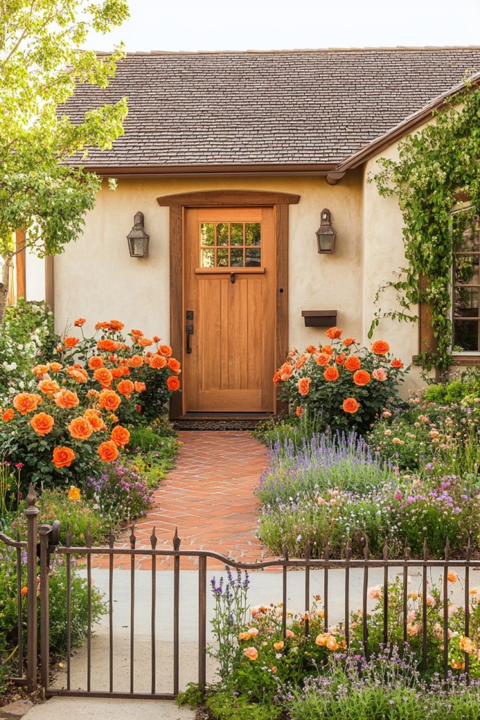 Vibrant orange and coral roses flank a brick pathway lined with thyme and sage. A low wrought-iron fence borders beds of wildflowers, while soft sunlight highlights the rustic wooden door, making this garden feel both playful and welcoming.