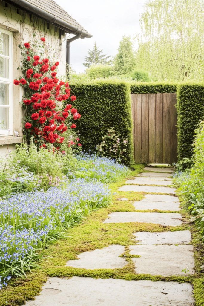 Wild crimson roses sprawl across the front wall of this enchanting garden. A moss-covered stone path leads to a rustic wooden door, while a low hedge encloses a bed of bluebells and forget-me-nots, creating a dreamy, secluded vibe.