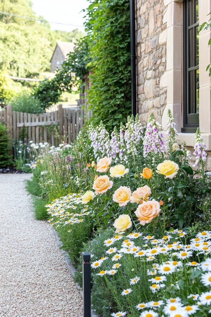 Soft peach and buttery yellow roses bloom beside a gravel path, while a low rustic fence encloses beds of daisies and foxgloves. Ivy climbs the stone facade of a quaint cottage, completing this cheerful, sun-drenched garden.