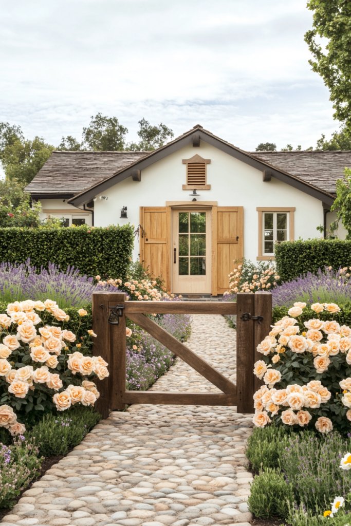 Peach and cream roses bloom around a wooden gate opening onto a cobblestone path, bordered by lavender and marigolds. A low hedge surrounds the space, while rustic shutters on the cottage windows complete this warm, inviting scene.