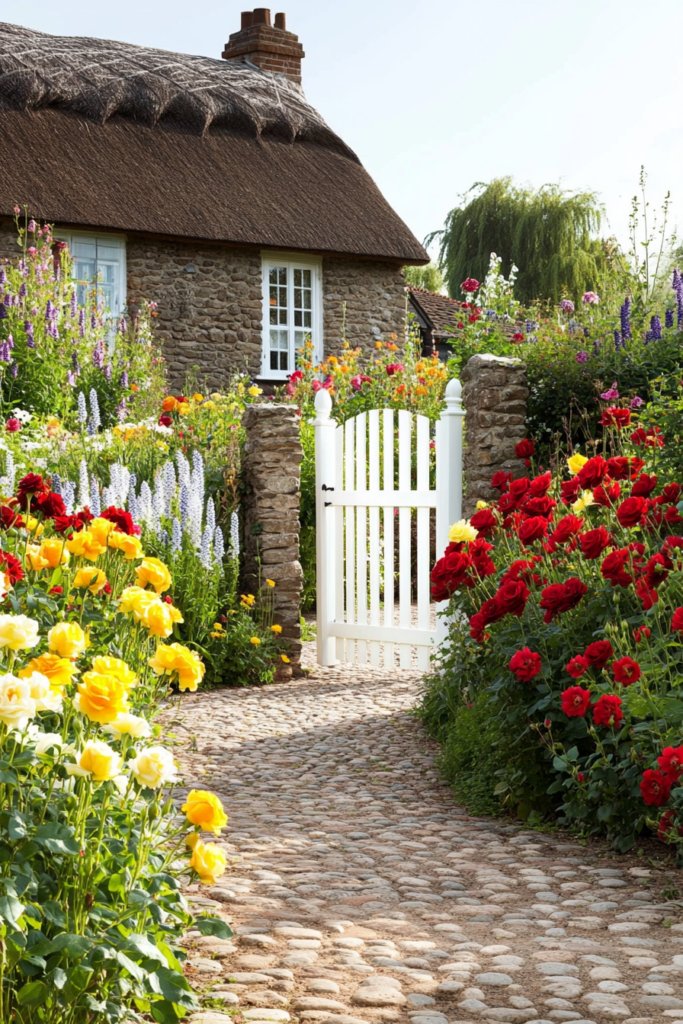 Bright red and yellow roses line a cobblestone path leading to a white wooden gate. Surrounded by foxgloves, lupines, and wildflowers, this lush front garden sits in front of a picture-perfect thatched roof cottage.