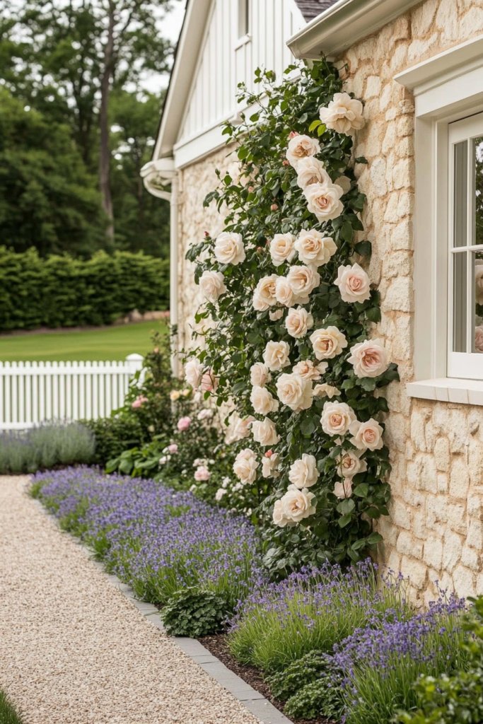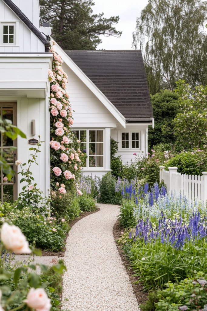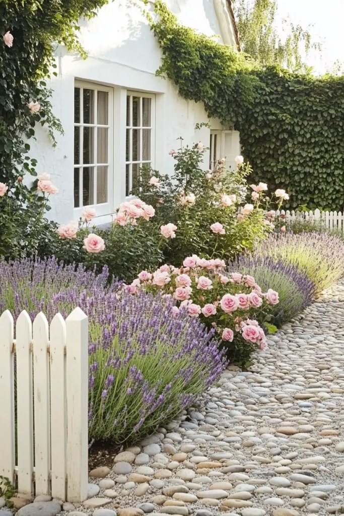 Cream and blush roses climb the walls of this stone cottage, while a gravel path bordered by bluebells and lavender adds soft texture. A low white fence encloses a fragrant herb bed, completing this tranquil front garden.