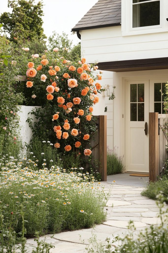 Vibrant orange and deep pink roses wrap around a trellis in this lively garden. A winding stone path winds through beds of wild chamomile, while a low wooden gate leads toward a cozy whitewashed cottage door for a welcoming, rustic touch.