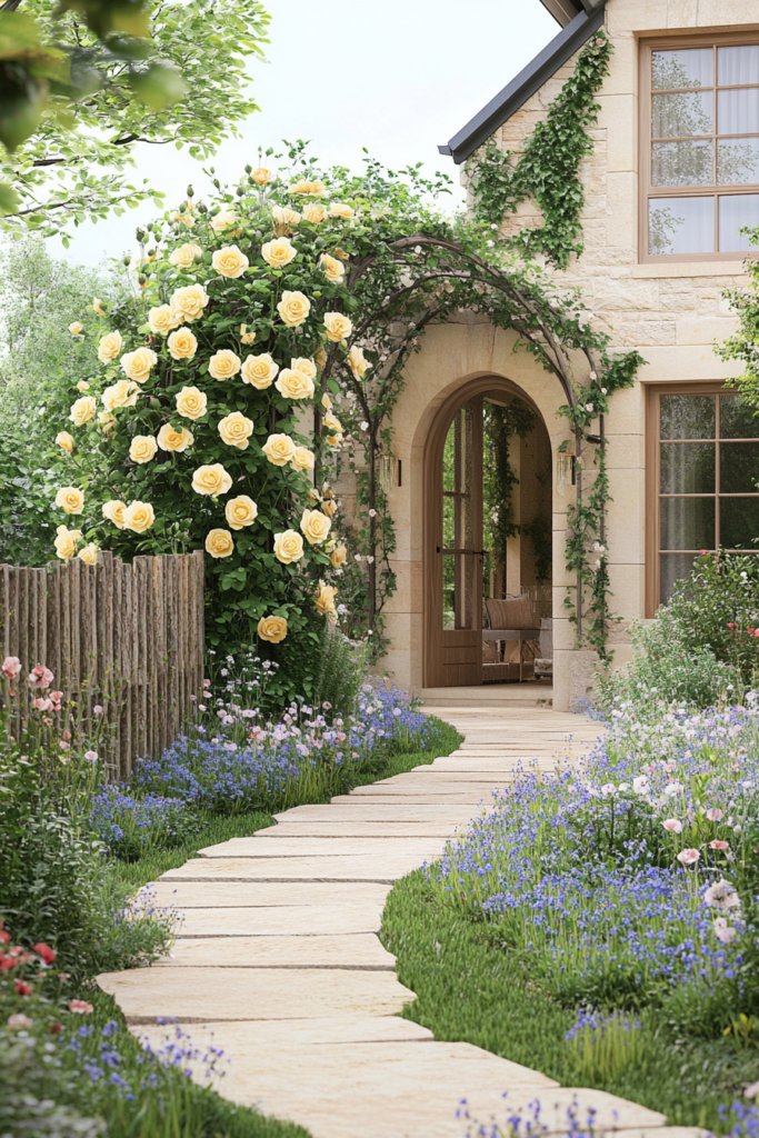 Soft yellow roses climb an arched trellis in this wild, natural garden. A winding stone path flanked by wild poppies and bluebells leads to a quaint cottage, while a rustic low fence and ivy-covered stone facade enhance the enchanted, untouched beauty.