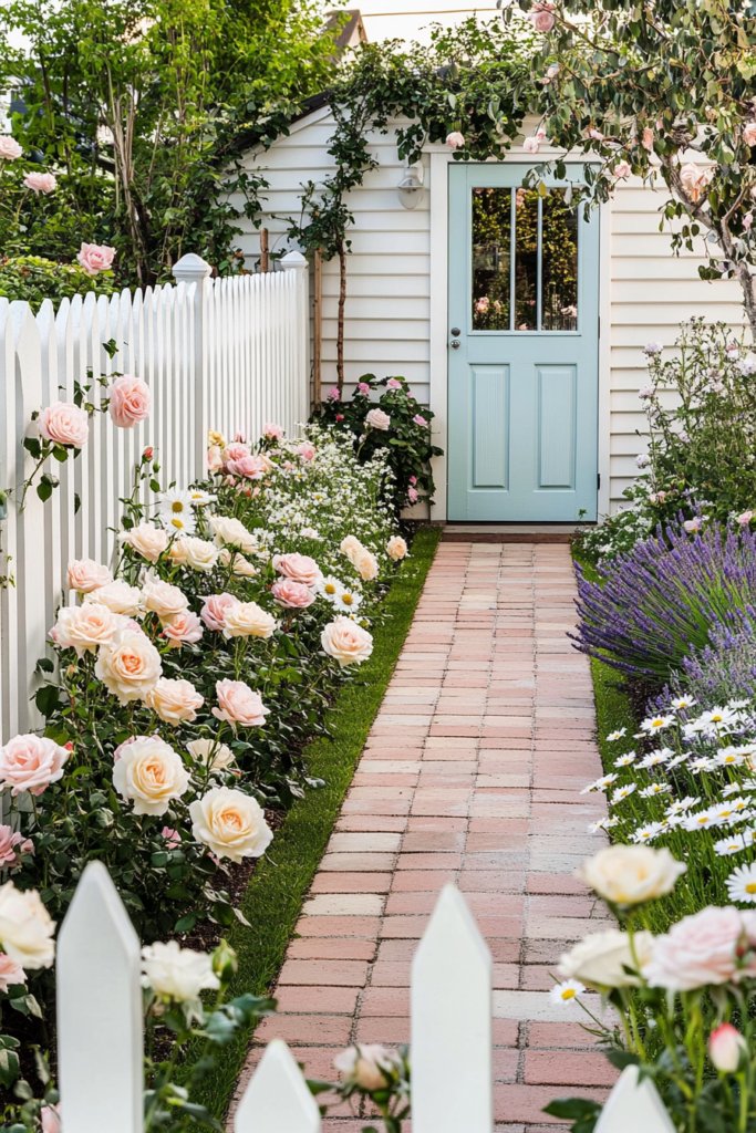 Soft pink and white roses line a straight brick path enclosed by a white picket fence. Daisies, lavender, and thyme accompany the flowers, while a pale blue wooden door adds a touch of charm to this neat, well-kept front garden.