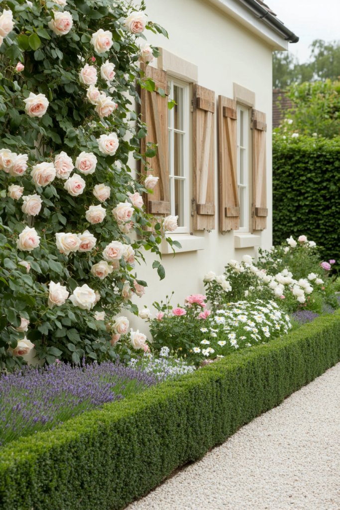 Cream and soft pink roses trail up the walls of this classic garden, framed by neatly clipped hedges. A gravel pathway weaves through beds of lavender and daisies, while rustic wooden shutters on the windows add a traditional English cottage charm.