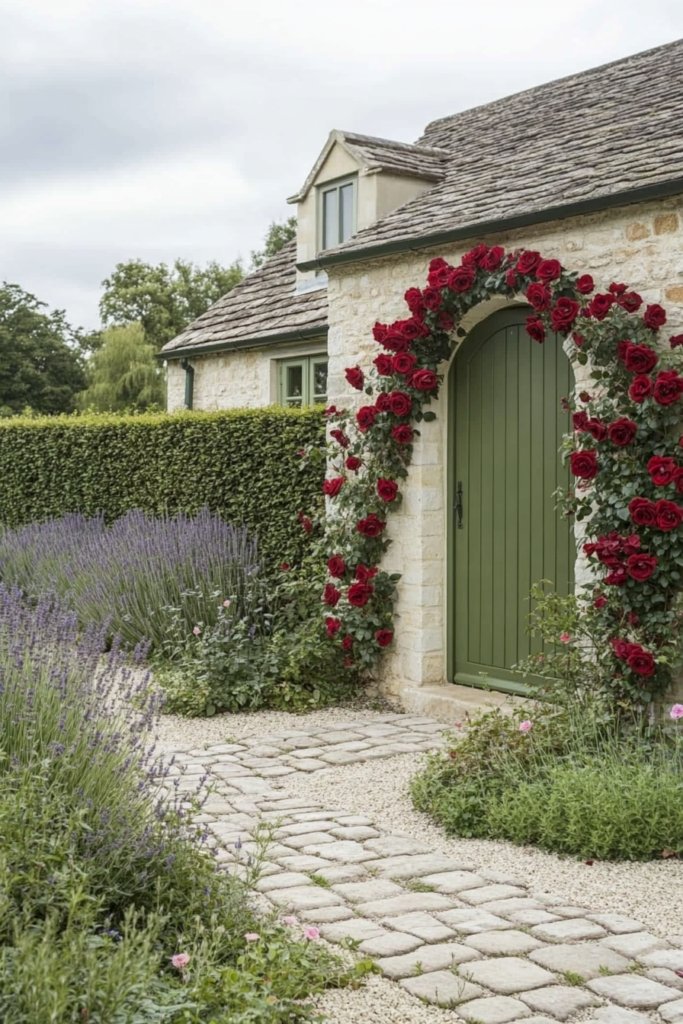 Deep crimson roses wrap around the entrance arch of this stone cottage. A cobblestone path leads to a green-painted door, while lavender and rosemary grow alongside the low hedge, creating a fragrant, peaceful entrance.