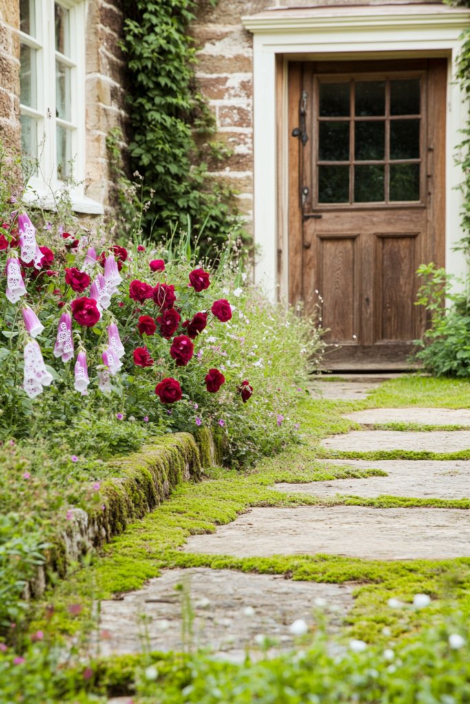 Crimson roses and foxgloves spill over a low stone wall, giving this front garden a wild, overgrown look. A moss-covered path leads toward a rustic wooden door framed by ivy-covered brickwork for a romantic, untamed feel.