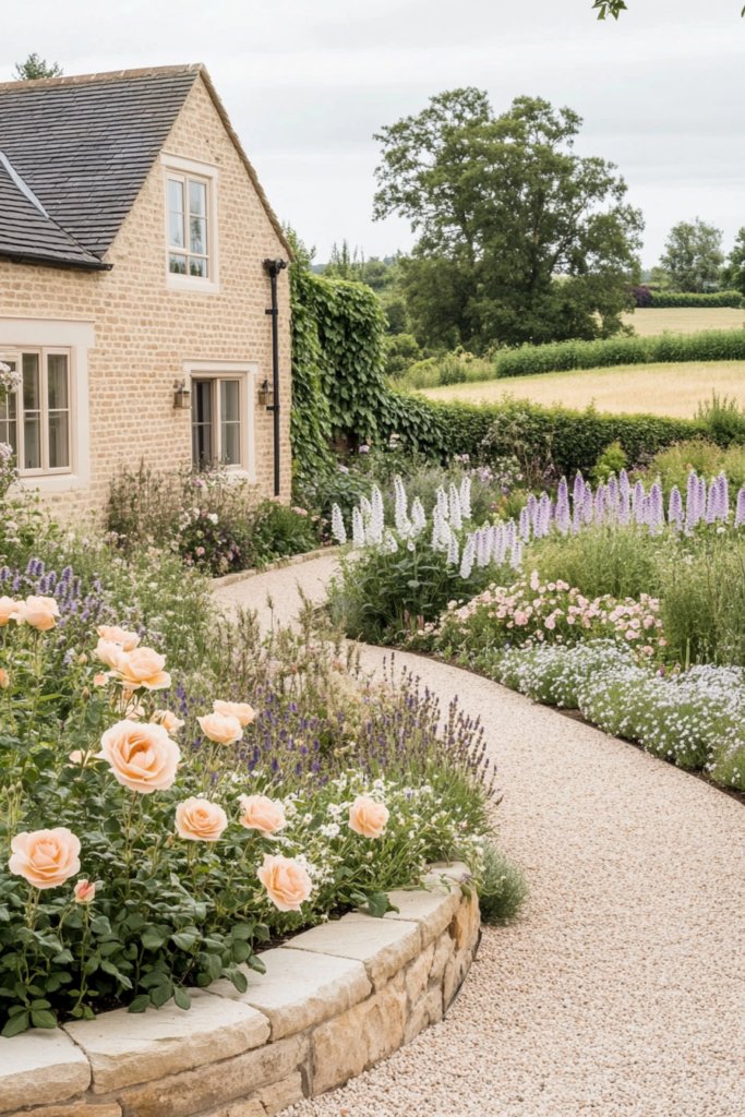 Soft peach roses and lavender bloom alongside a winding gravel path. A low stone wall encloses beds of foxgloves and wild chamomile, while an ivy-covered brick cottage beyond completes this tranquil, countryside escape.