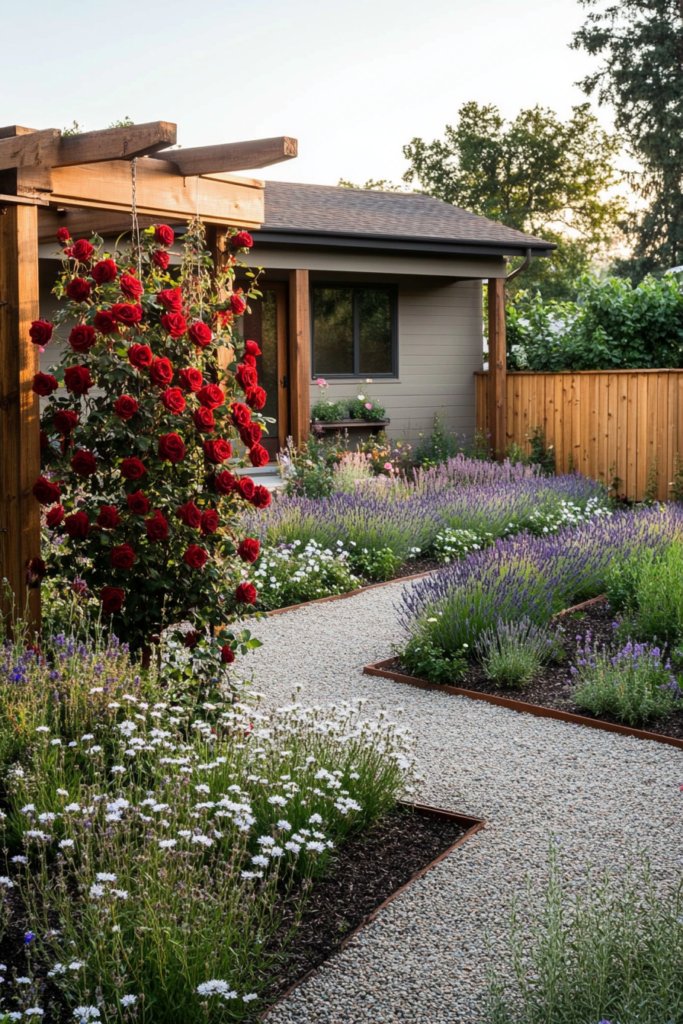 Deep red roses wind around a wooden trellis by the porch, while a gravel path leads through neatly planted beds of lavender, daisies, and rosemary. A low wooden fence encloses this cozy cottage space, offering a peaceful sanctuary.