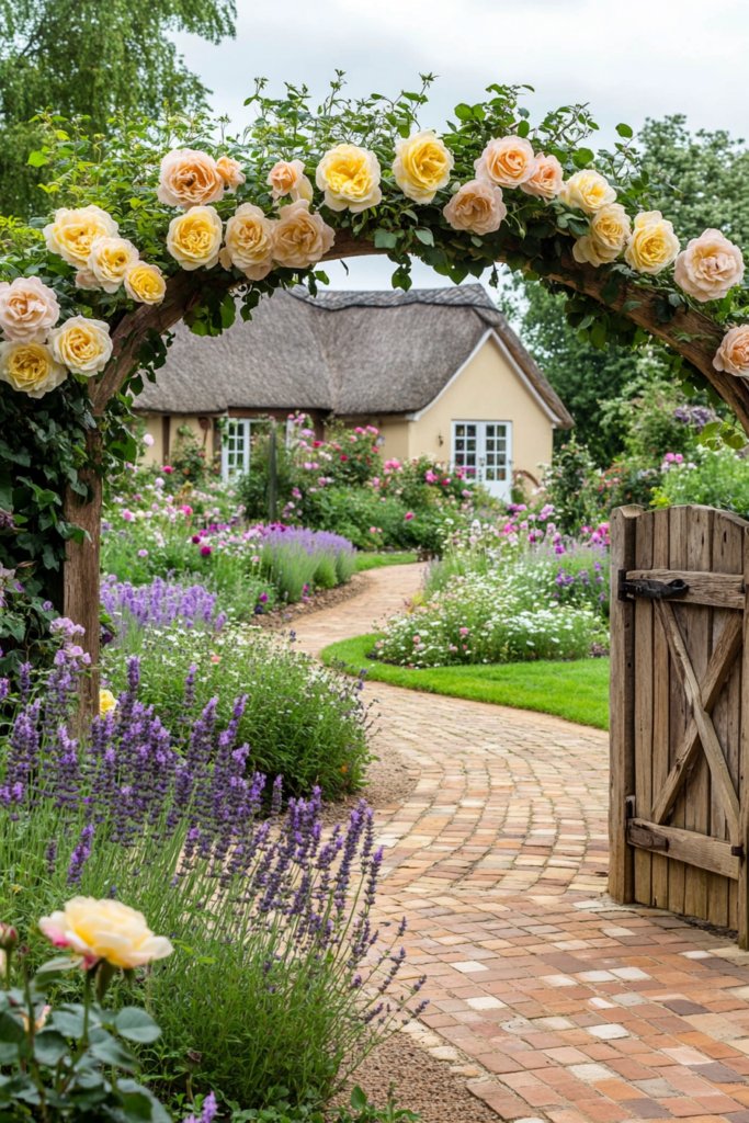 Magenta and pale yellow roses arch gracefully over a rustic wooden gate. A winding brick path, lined with lavender and hollyhocks, leads to a thatched roof cottage, creating a magical, storybook-like setting.