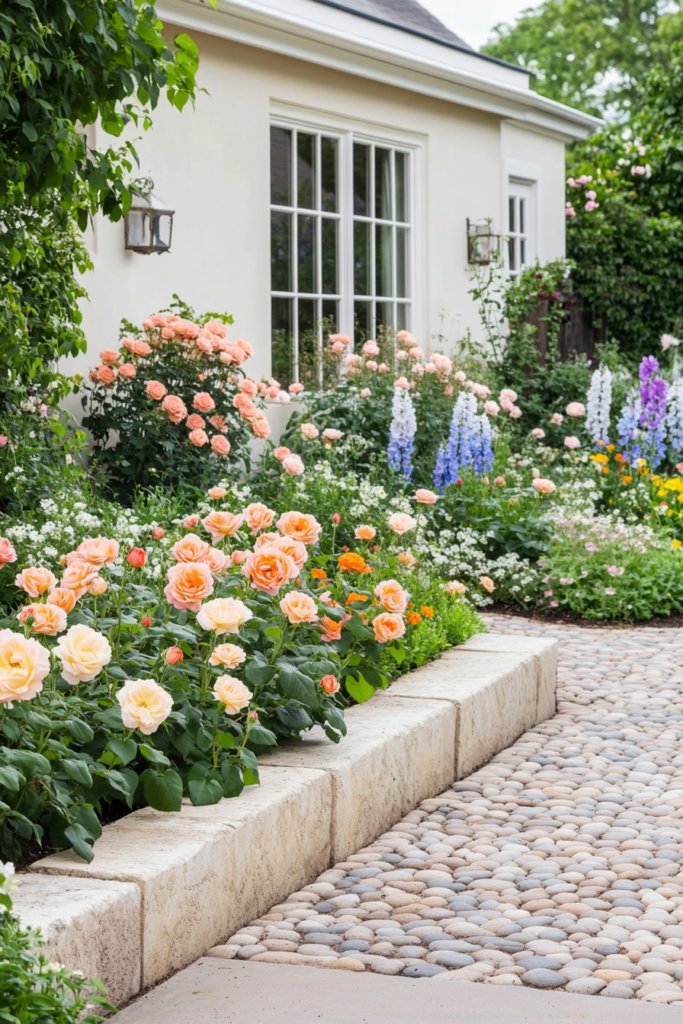 Coral and blush frame the entrance of this charming cottage, while hollyhocks and delphiniums line a cobbled pathway. A low stone wall encloses lush flowerbeds, creating a welcoming, romantic feel with vibrant colors and soft textures.