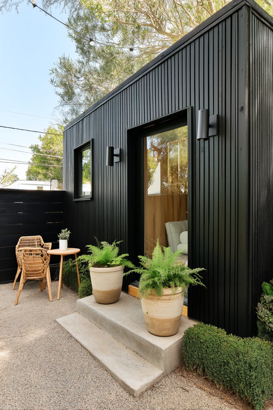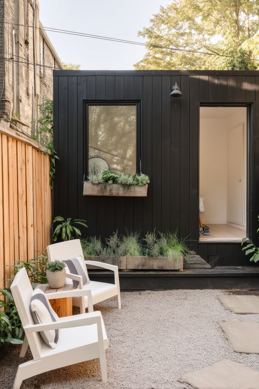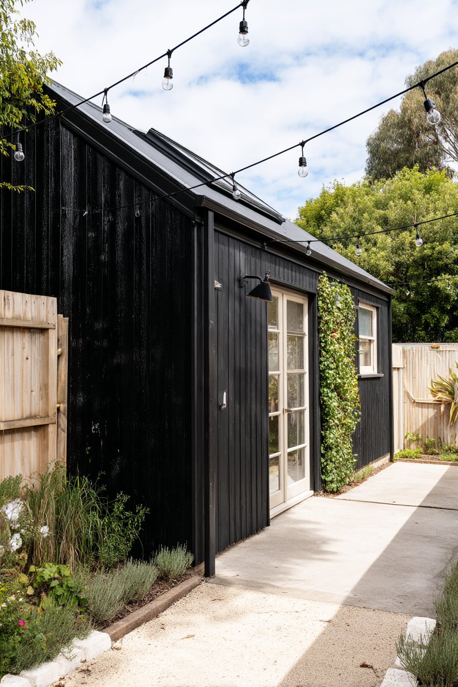 The striking contrast of the modern black shed against lush greenery creates a chic minimalist vibe, enhanced by trailing ivy and fragrant lavender. To achieve a similar look, incorporate simple pathways with gravel and choose low-maintenance plants for a clean, stylish aesthetic.