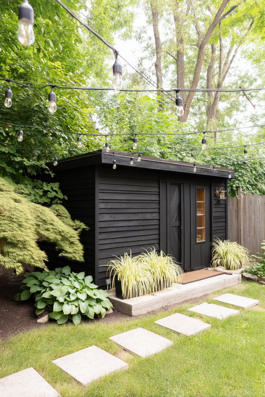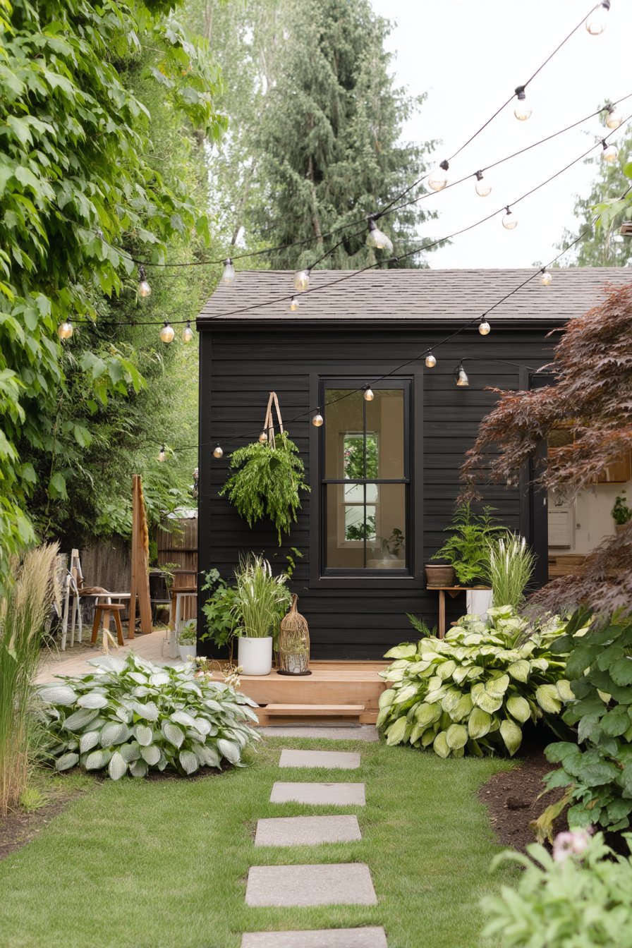 The sleek black shed contrasts beautifully with lush hostas and vibrant ornamental grasses, creating a modern yet inviting atmosphere. To replicate this look, use simple stone pathways and incorporate layered plantings for texture and depth.