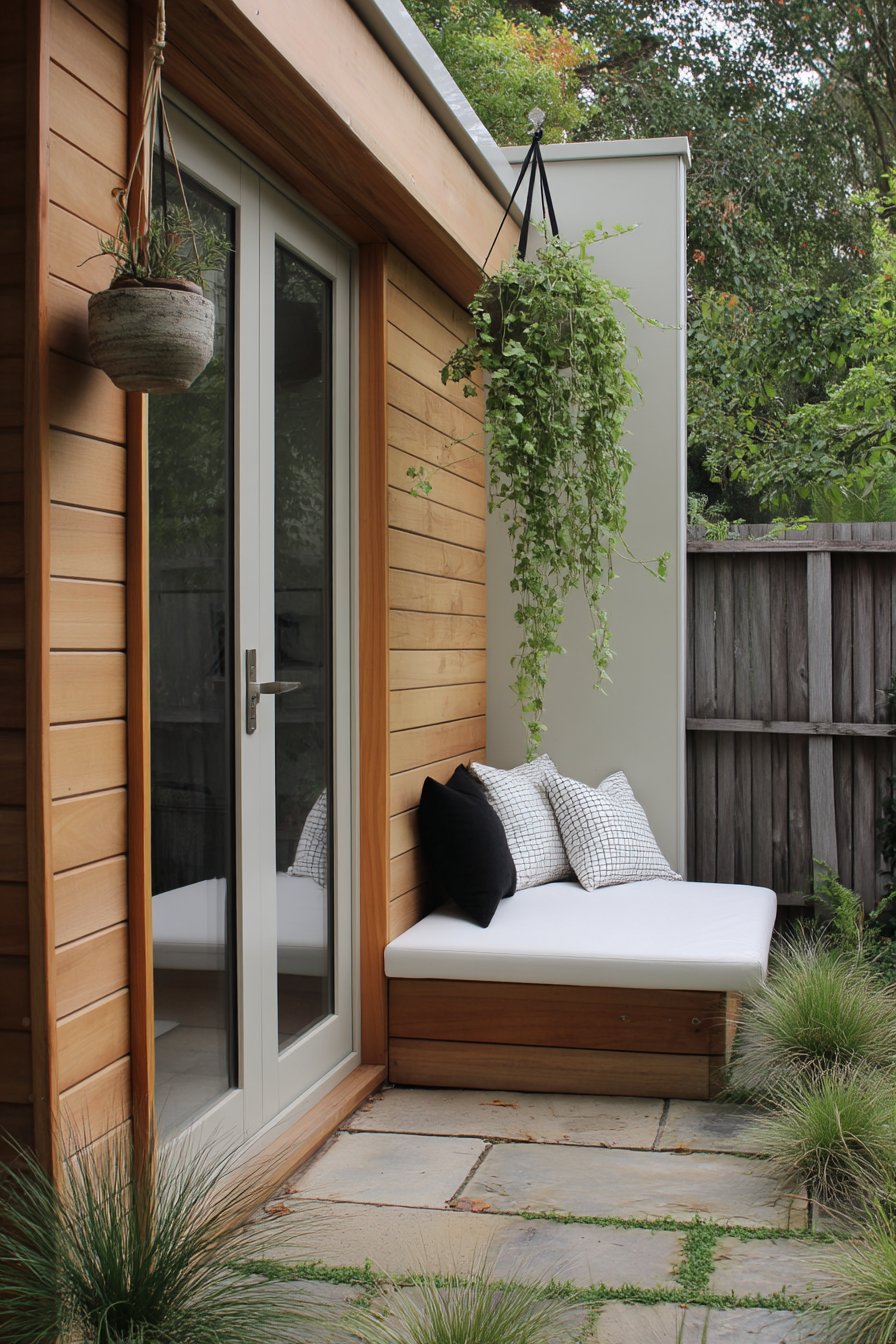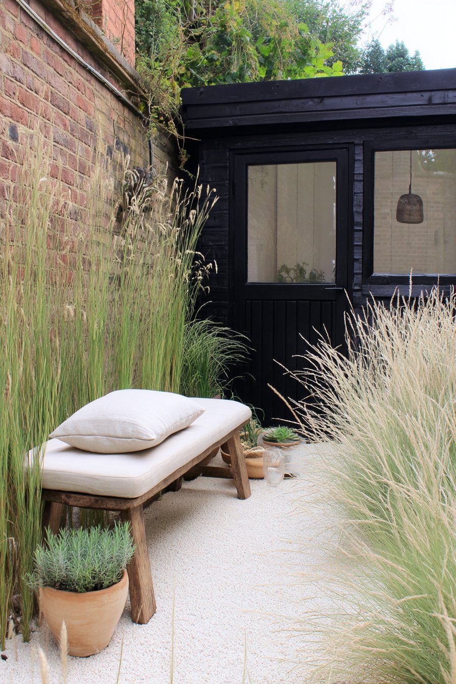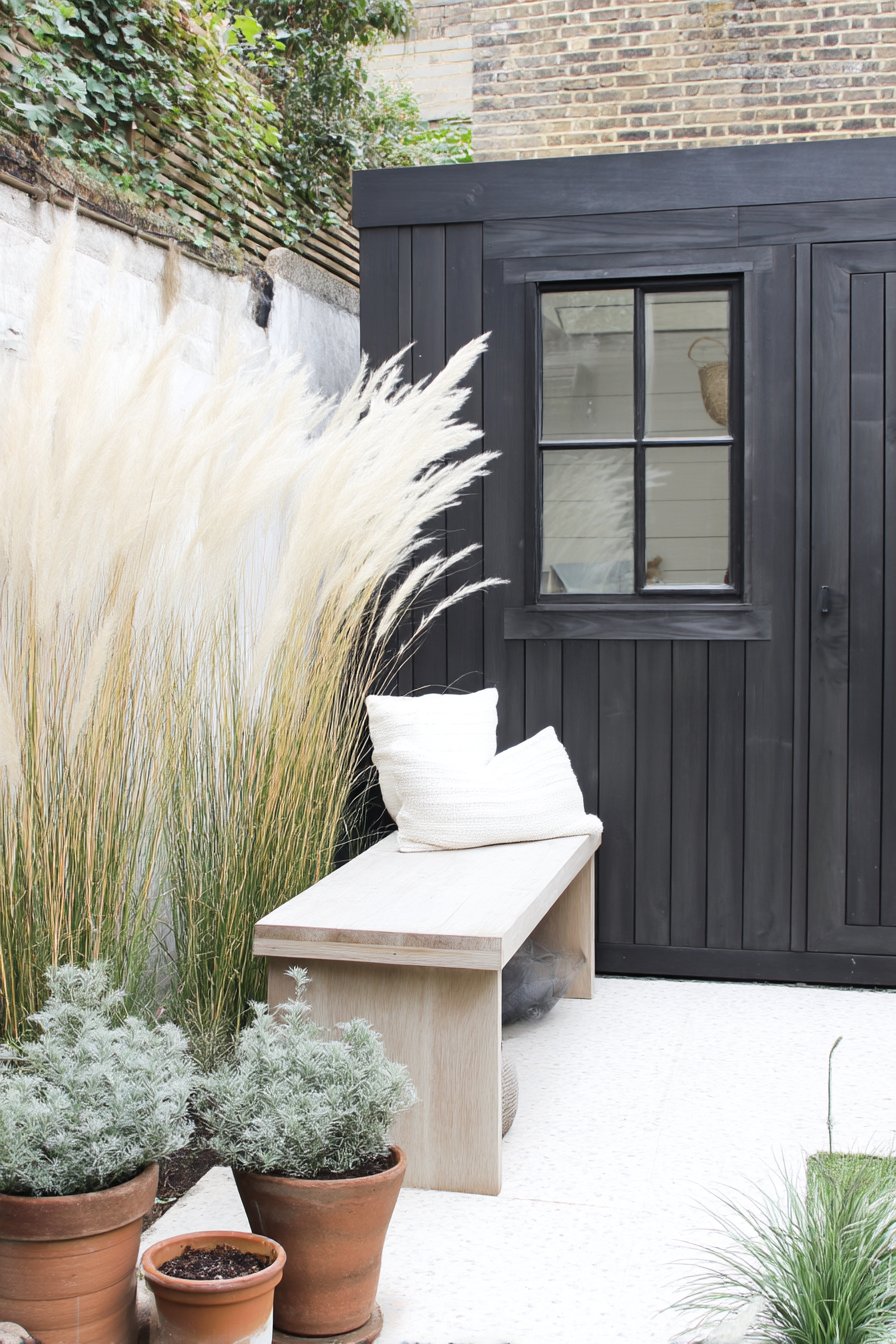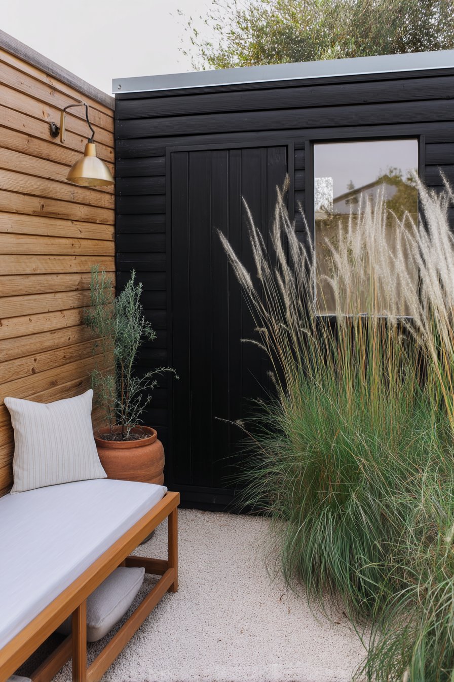 The sleek lines of the wooden and black structures beautifully contrast with the soft textures of ornamental grasses, creating a serene outdoor retreat. Incorporate similar low-maintenance plants like pampas grass and a cozy seating area to achieve this modern, minimalist vibe.