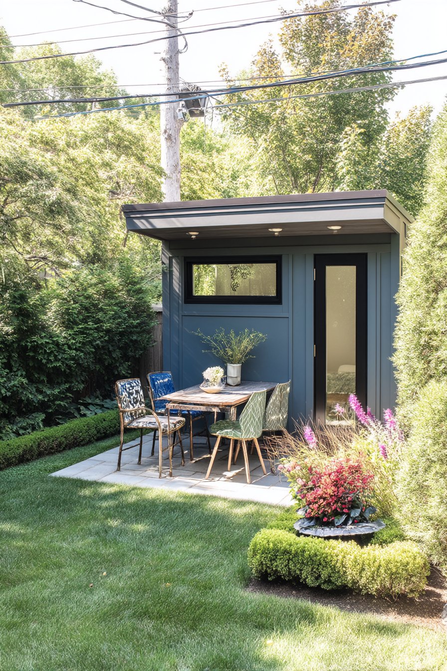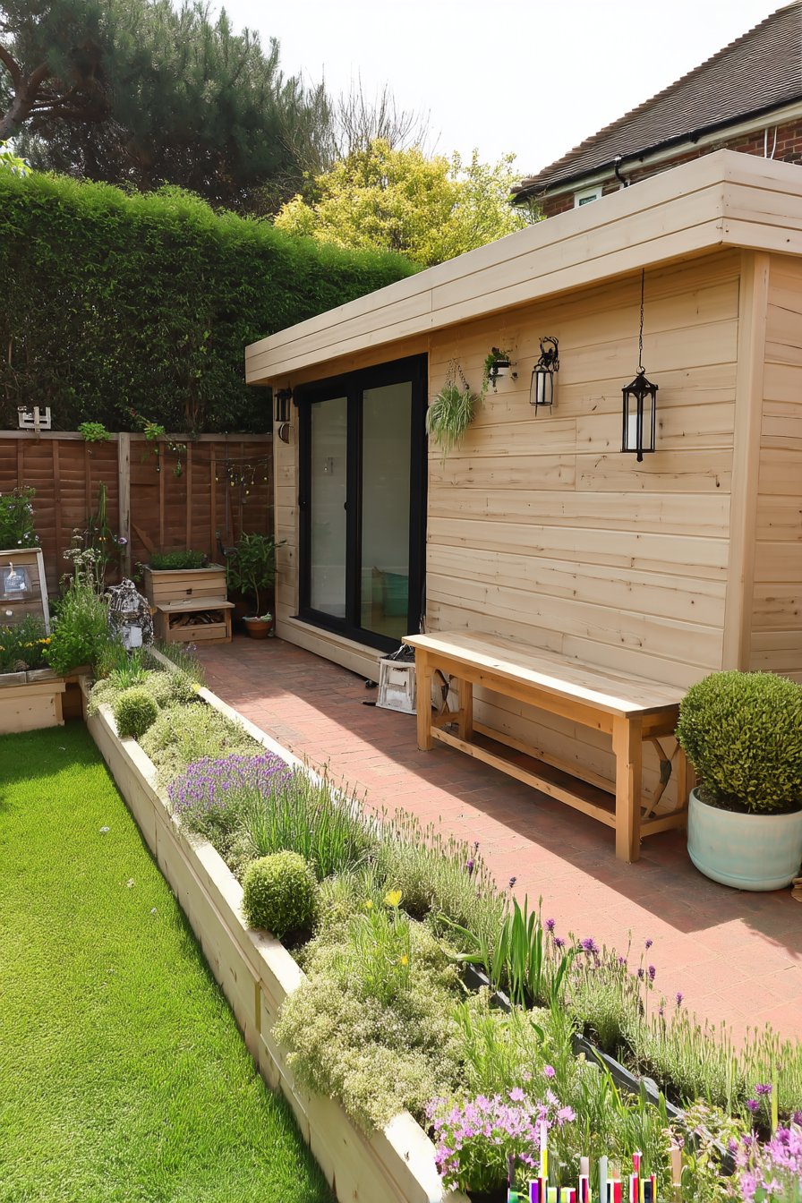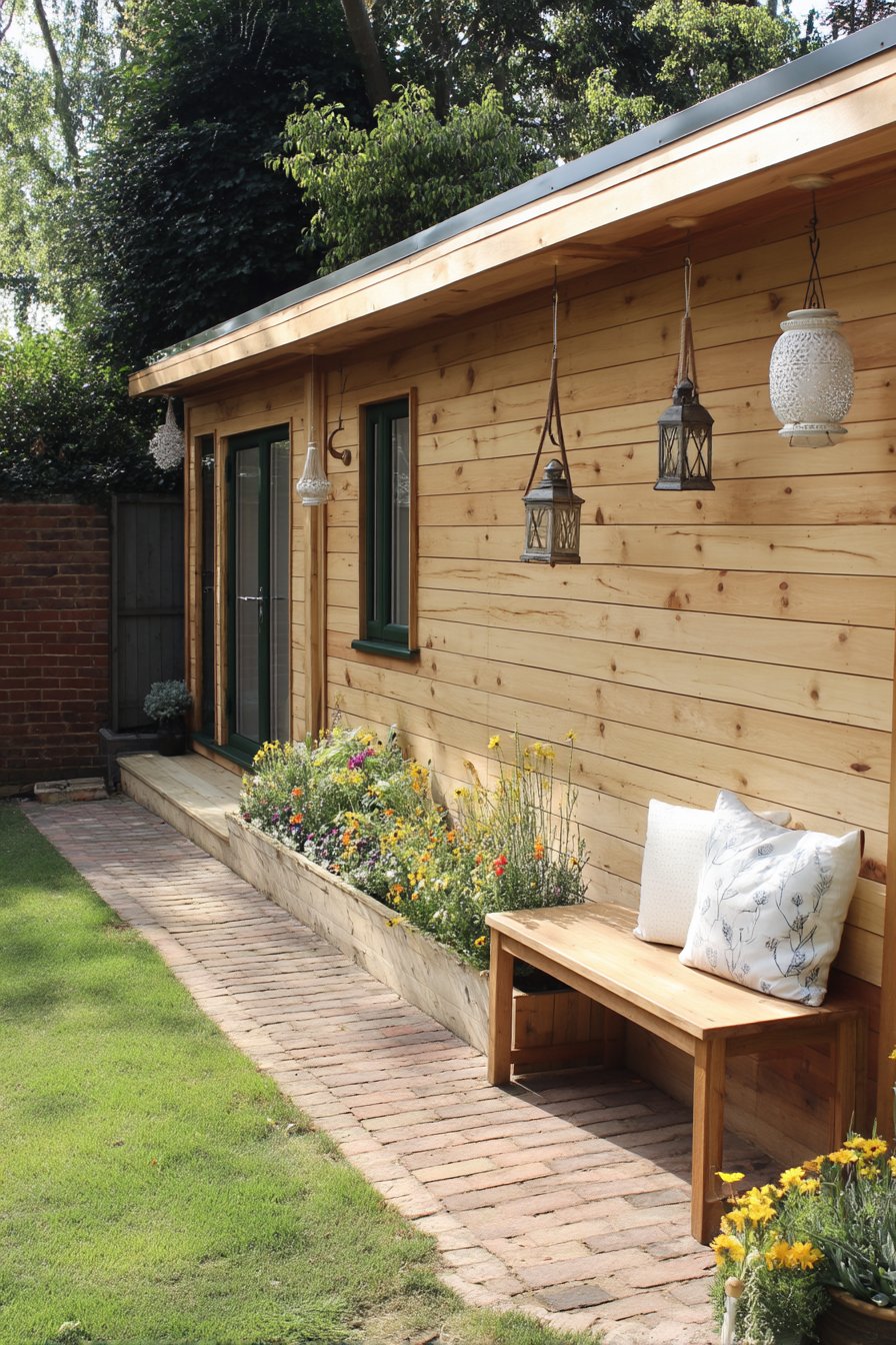 The harmonious blend of wildflowers, including daisies and vibrant marigolds, creates a lively border that softens the modern shed’s sleek lines. To replicate this look, choose native plants for easy maintenance and seasonal blooms that attract pollinators.